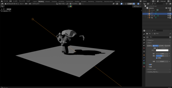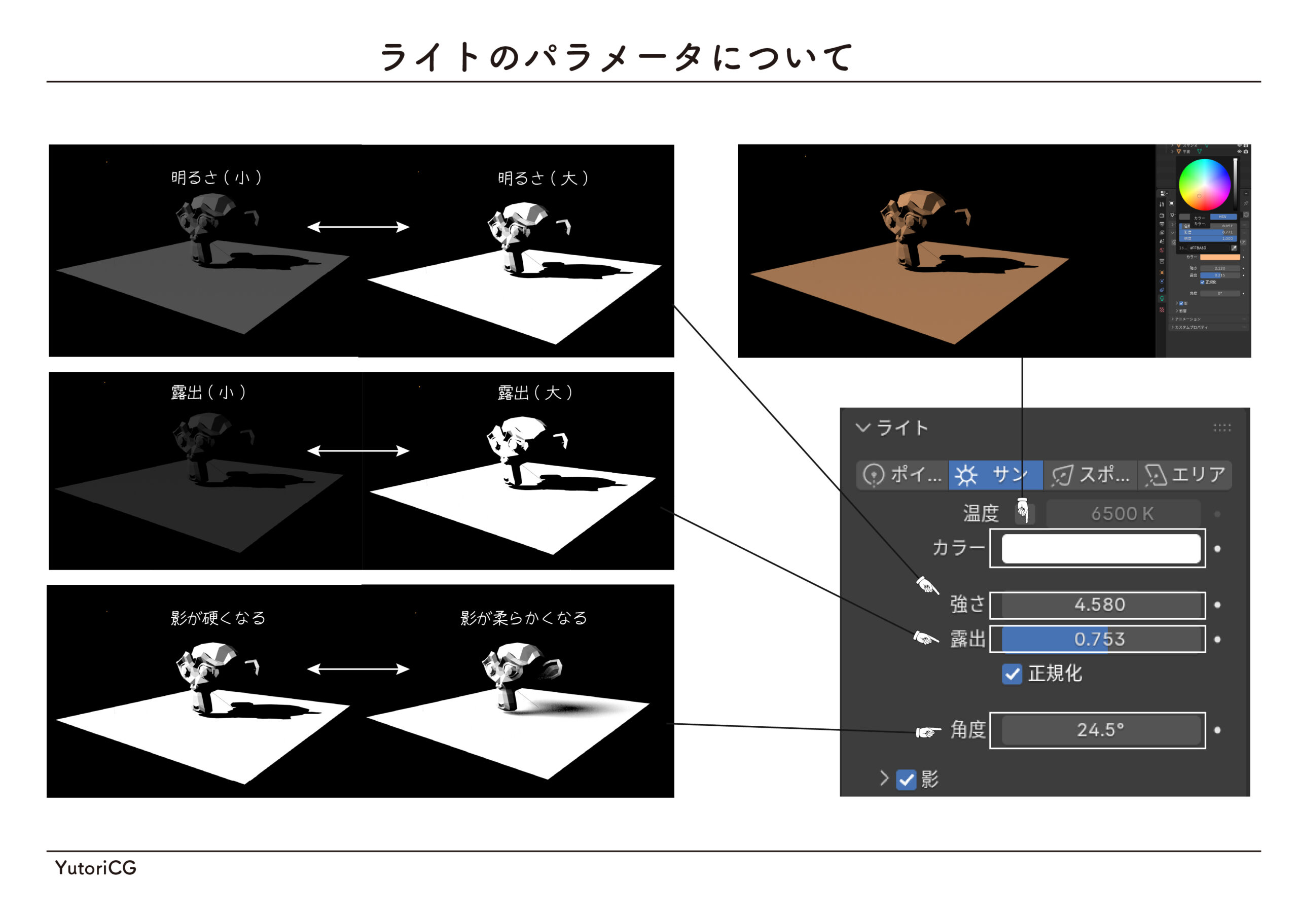 続いて、ライトのパラメータを操作してみましょう。各パラメータの説明は以下の通りです。主にカラー、強さ=明るさ、露出の強さ、角度を調整して様々な影の形や演出を行います。
