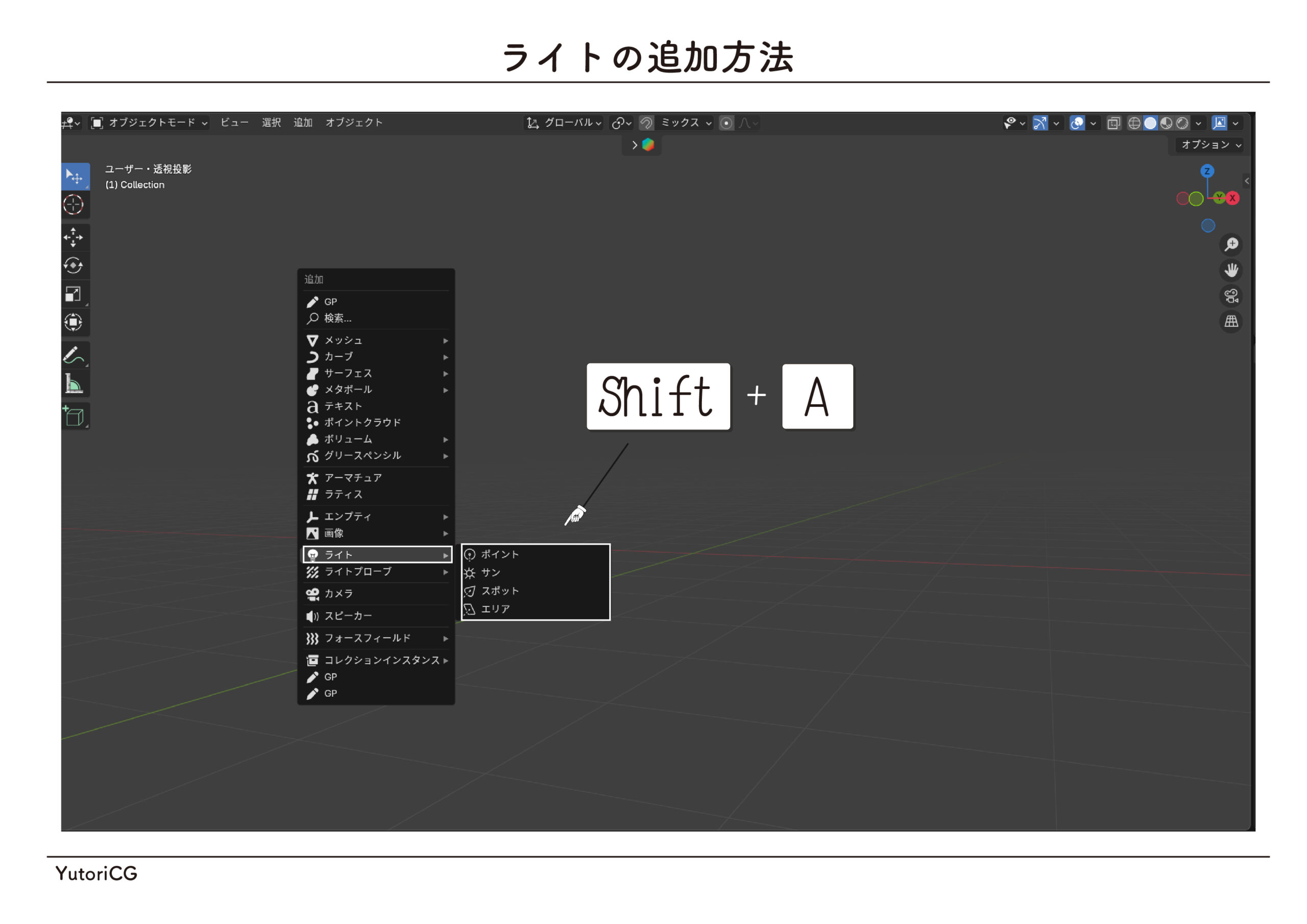 ここからライトを追加します。「追加(Shift + A)」からライトを選択し、配置します。
