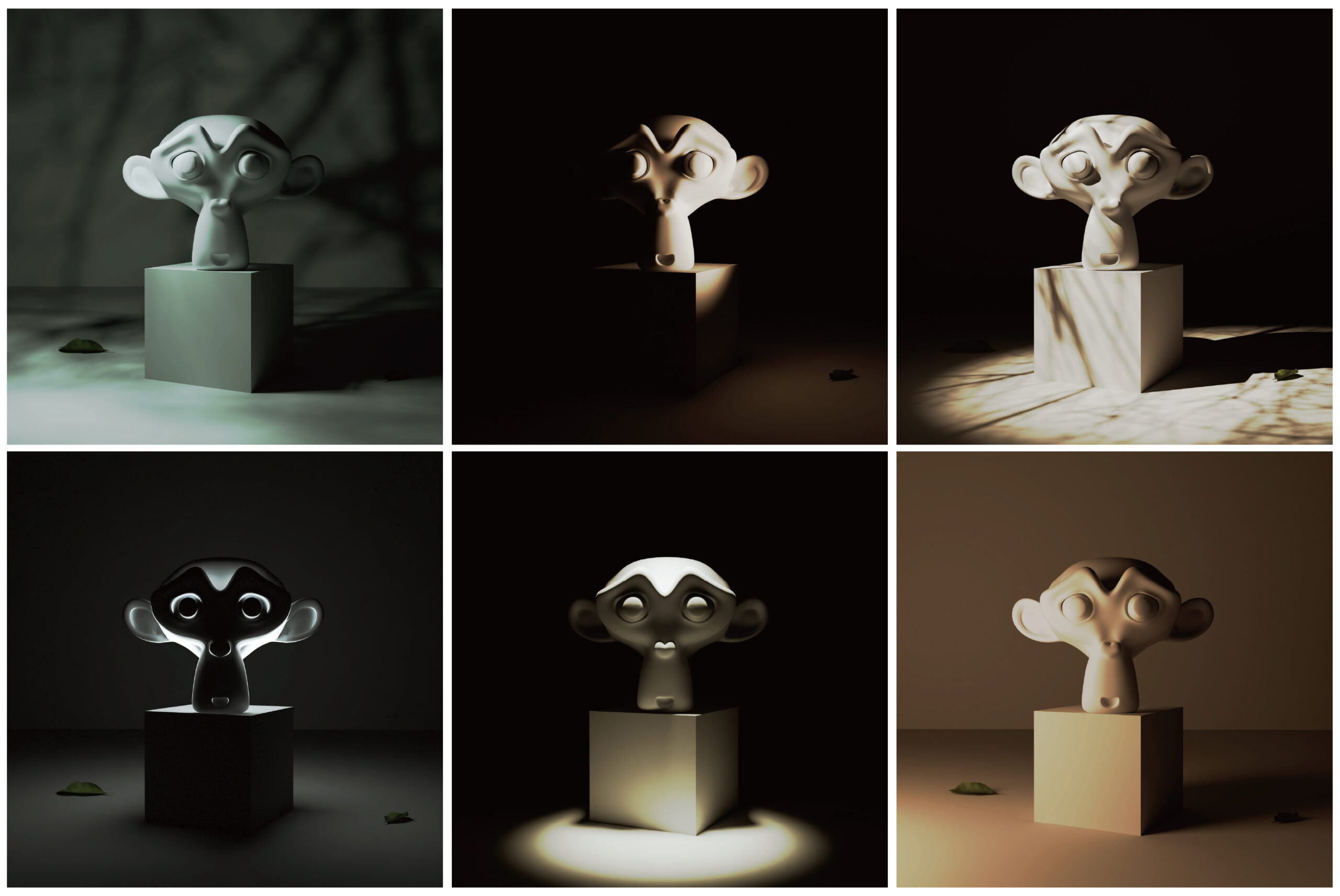 こちらは、モデルや空間を一切変更せず、ただ光の当て方、色、強度、範囲をコントロールしてできたものです。