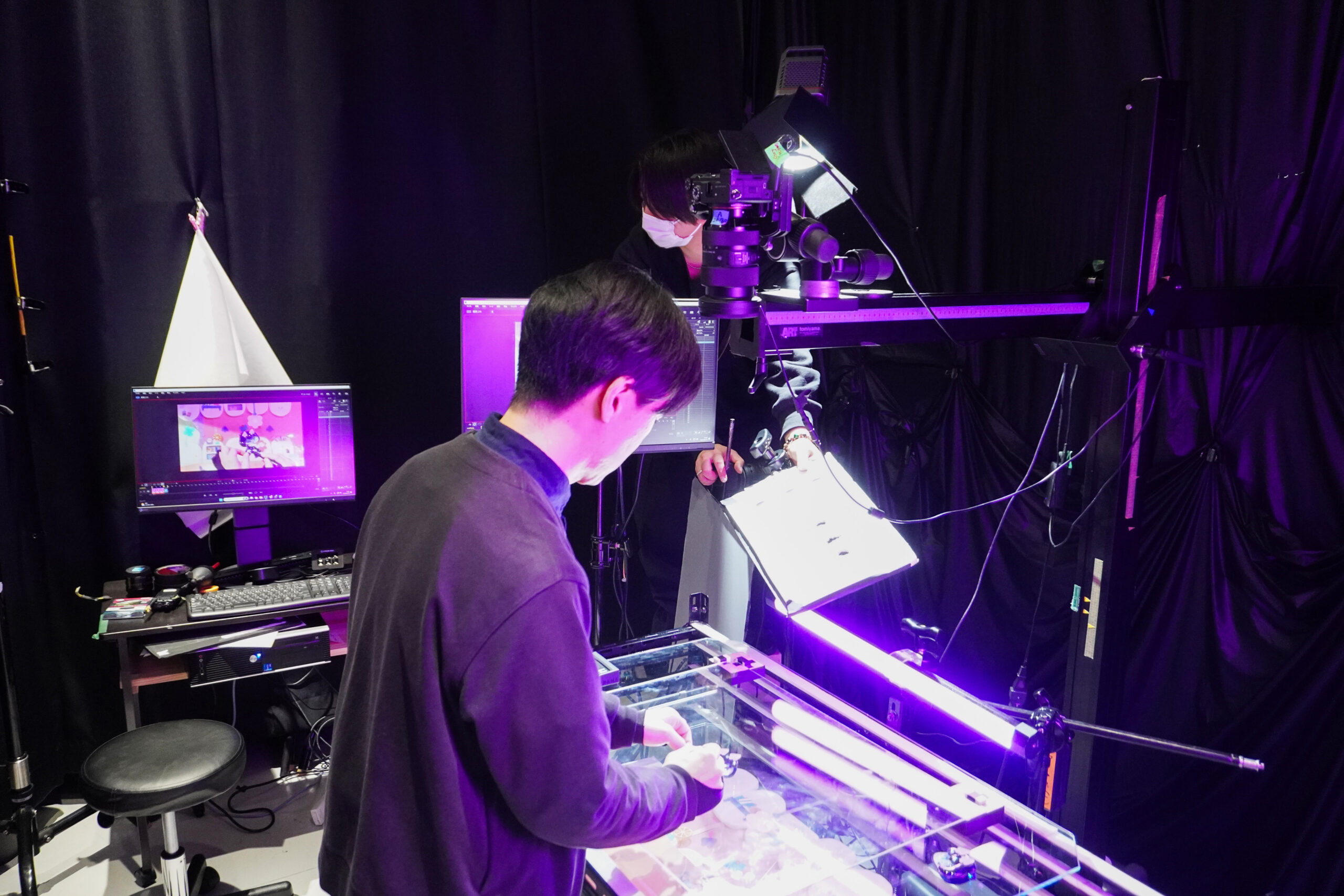 照明もモニターで確認しながら細やかな調整が繰り返される。 演出/アニメーター:髙野真さん(手前) 照明演出補佐:中村嵩羽さん(奥)