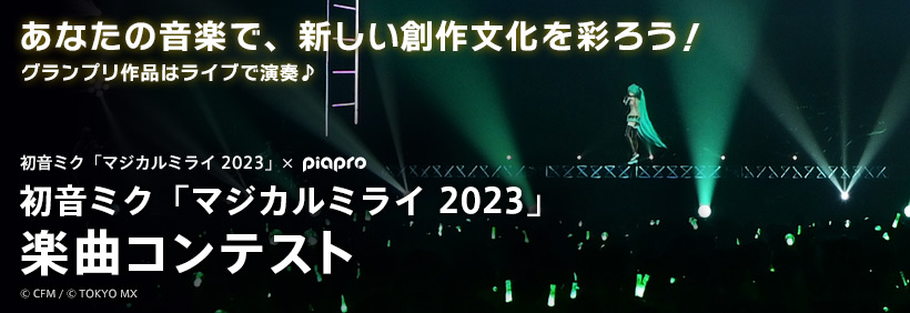 - グランプリ作品が演奏されるライブのペアチケット(現地への旅費はご本人にて負担)または、『初音ミク「マジカルミライ 2023」』公式グッズ詰め合わせ