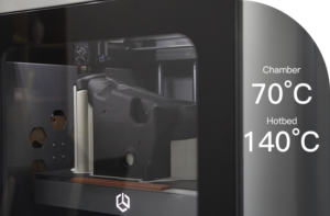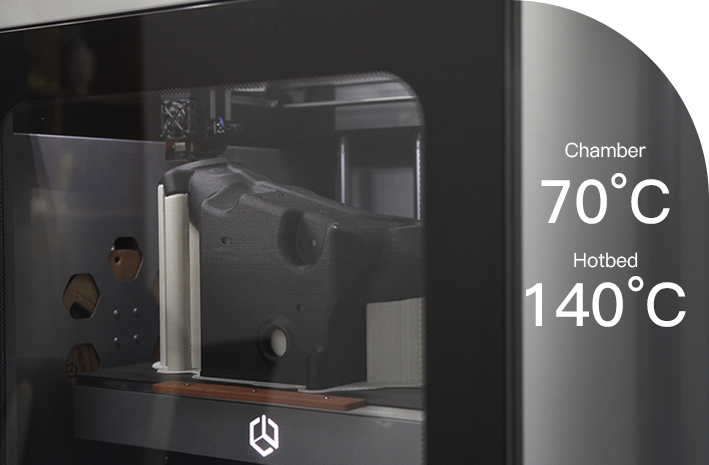 チャンバー内は最大70℃まで加熱でき、ホットベッドは最大140℃まで加熱できます。これにより、温度管理が難しいABSやASAなどの素材でも、収縮やひび割れを防ぎ、最高の品質で造形を完了させます。プロフェッショナル向けの精密な製品づくりに最適な環境を提供します。