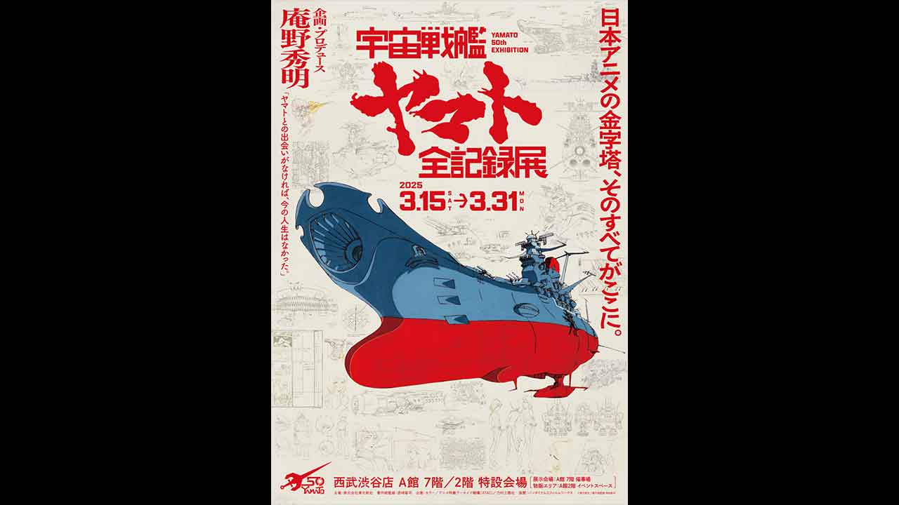 東京・西武渋谷店にて庵野秀明 企画・プロデュース/放送50周年記念「宇宙戦艦ヤマト 全記録展」が2025年3月15日より開催。本展では、松本零士氏の手によってブラッシュアップされていった数々の初期キャラクター案や、ヤマト艦の設定資料の展示のほか、「ヤマト50年の航海を辿る大年表」では、歴代のポスタービジュアルをはじめ、当時の雑誌や新聞の切り抜き、各作品の設定画などが年代に沿って壁一面に展示されるなど、ファン必見の展示内容となっています。