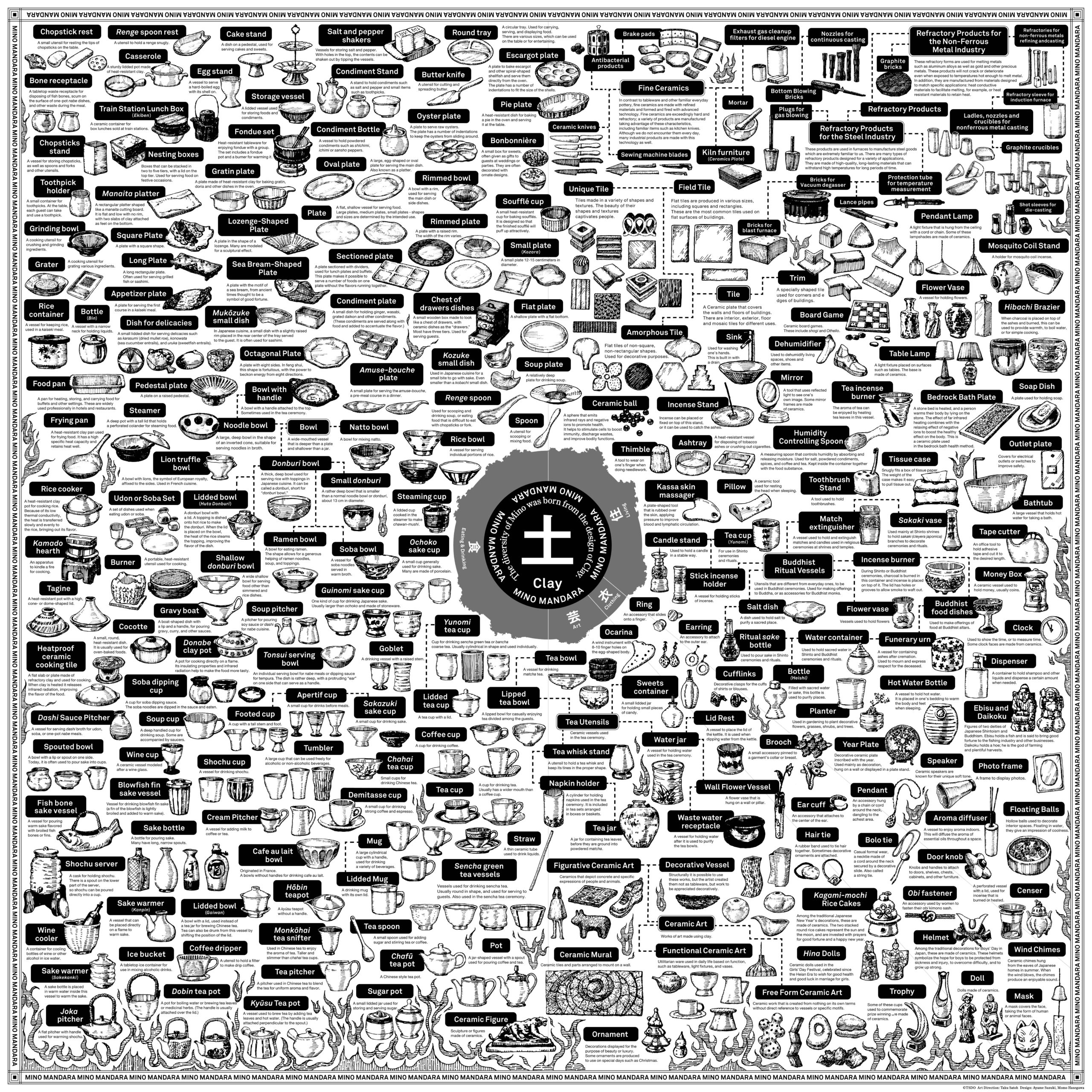 ⚫︎日本のラーメン丼の9割を生産する、美濃焼の産地について紹介します。やきものの根本を支え、無限のバリエーションを生み出す源泉としての「土」に注目し、美濃の窯業を卓越させてきた最大の特長を「土をデザインする技術」ととらえます。美濃ではどのような土を用い、どのような製品がつくられてきたのか。西部裕介による写真と山中 有による映像と合わせて、曼荼羅のように広がる土とやきものの関係を紹介します。