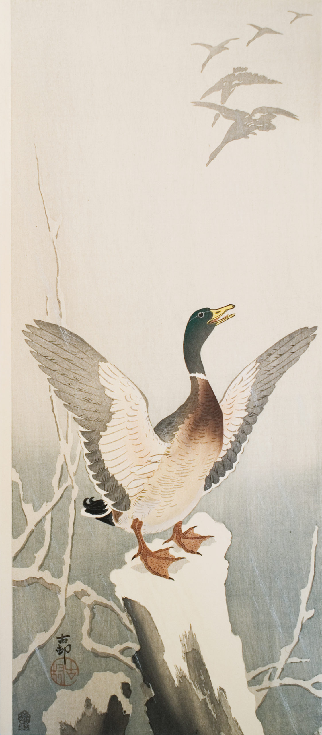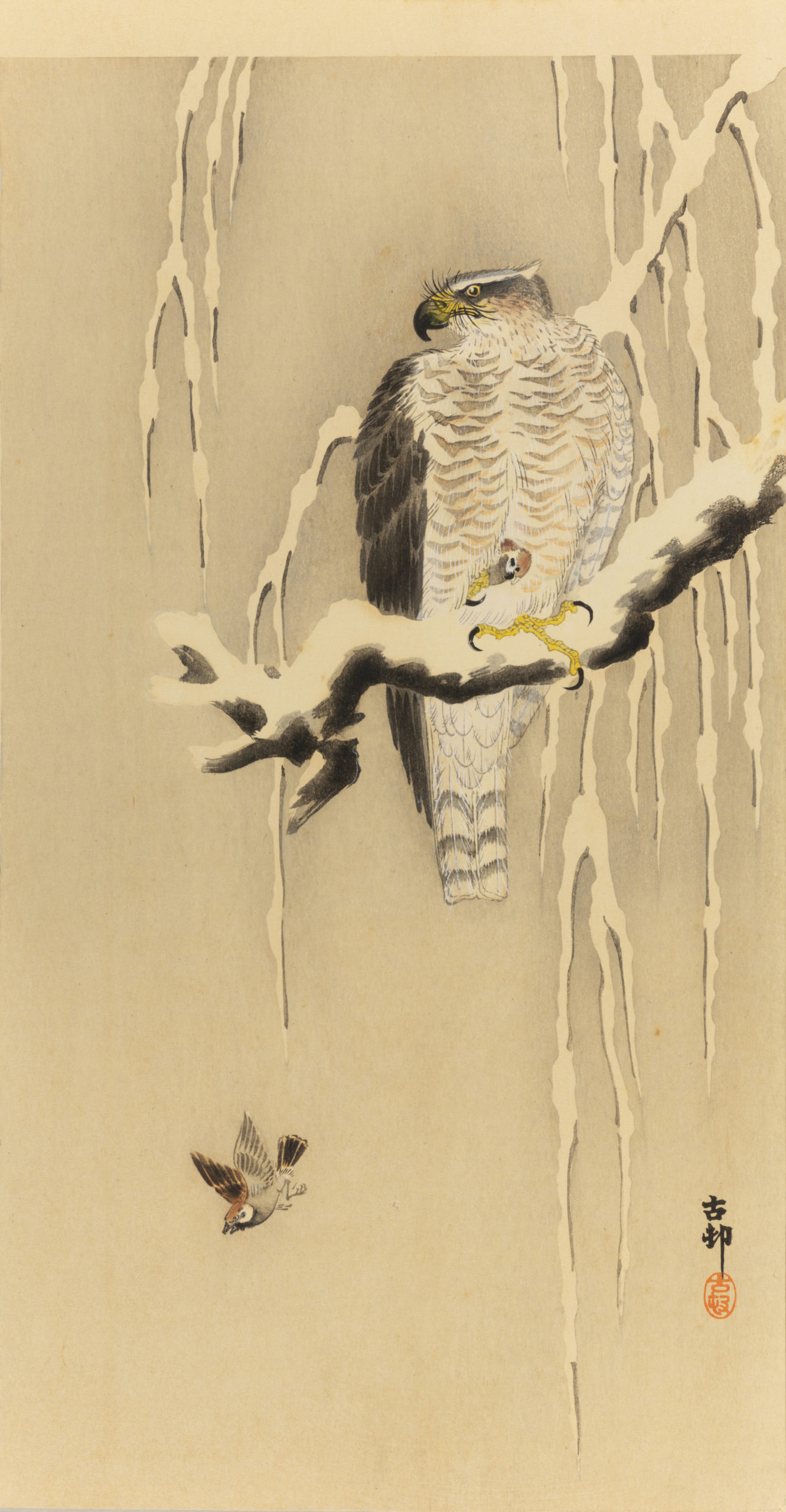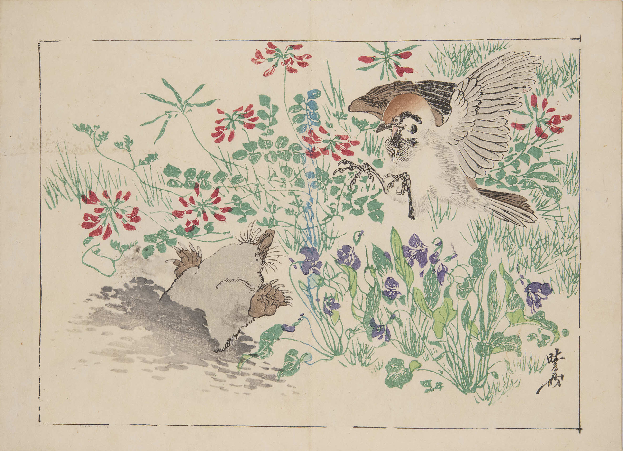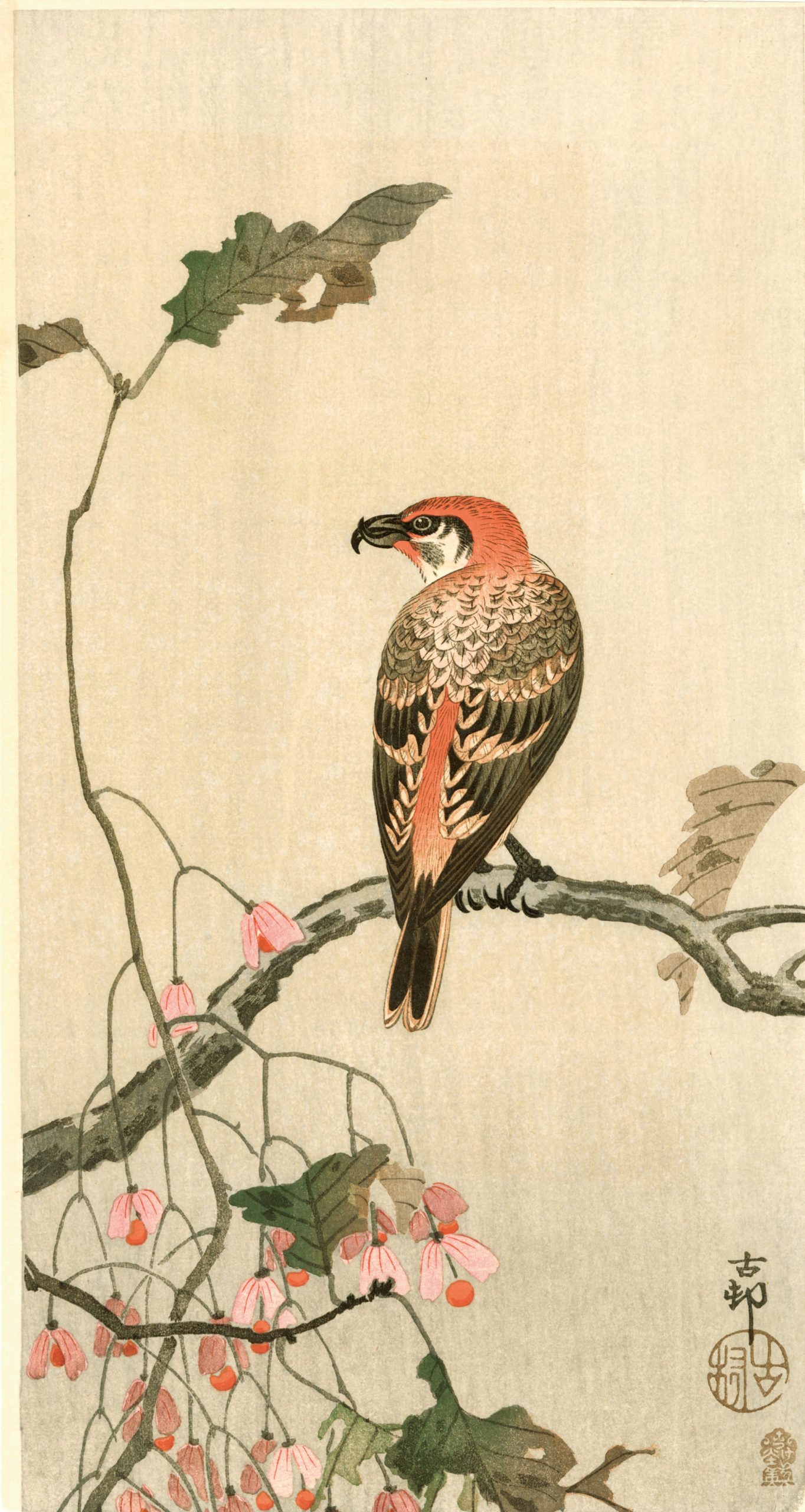 江戸時代や明治時代、さまざまな絵師たちによって個性あふれる花鳥画が制作されました。本展では、古邨の花鳥画の先駆けとなる、歌川広重や河鍋暁斎、渡辺省亭などの絵師たちによる花鳥画の版画や版本も合わせて紹介することで、浮世絵における花鳥画の魅力をより深くお伝えいたします。