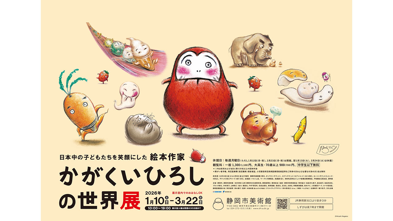 累計発行部数1000万部を超え、子どもたちに長く愛され続ける絵本『だるまさん』シリーズの作者・かがくいひろしの展覧会「かがくいひろしの世界展」が、1月10日より静岡市美術館にて開催決定!本展では、全16作品の絵本原画をはじめ、創作の源となったアイデアノートや教員時代の映像記録、未完のラフスケッチなど、貴重な資料を通して、かがくいの創作の軌跡と絵本の魅力に迫ります。
