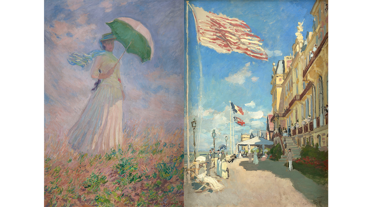 右:クロード・モネ《トルーヴィル、ロシュ・ノワールのホテル》1870年、油彩・カンヴァス、オルセー美術館蔵 Photo © GrandPalaisRmn (musée d’Orsay) / Gabriel de Carvalho / distributed by AMF