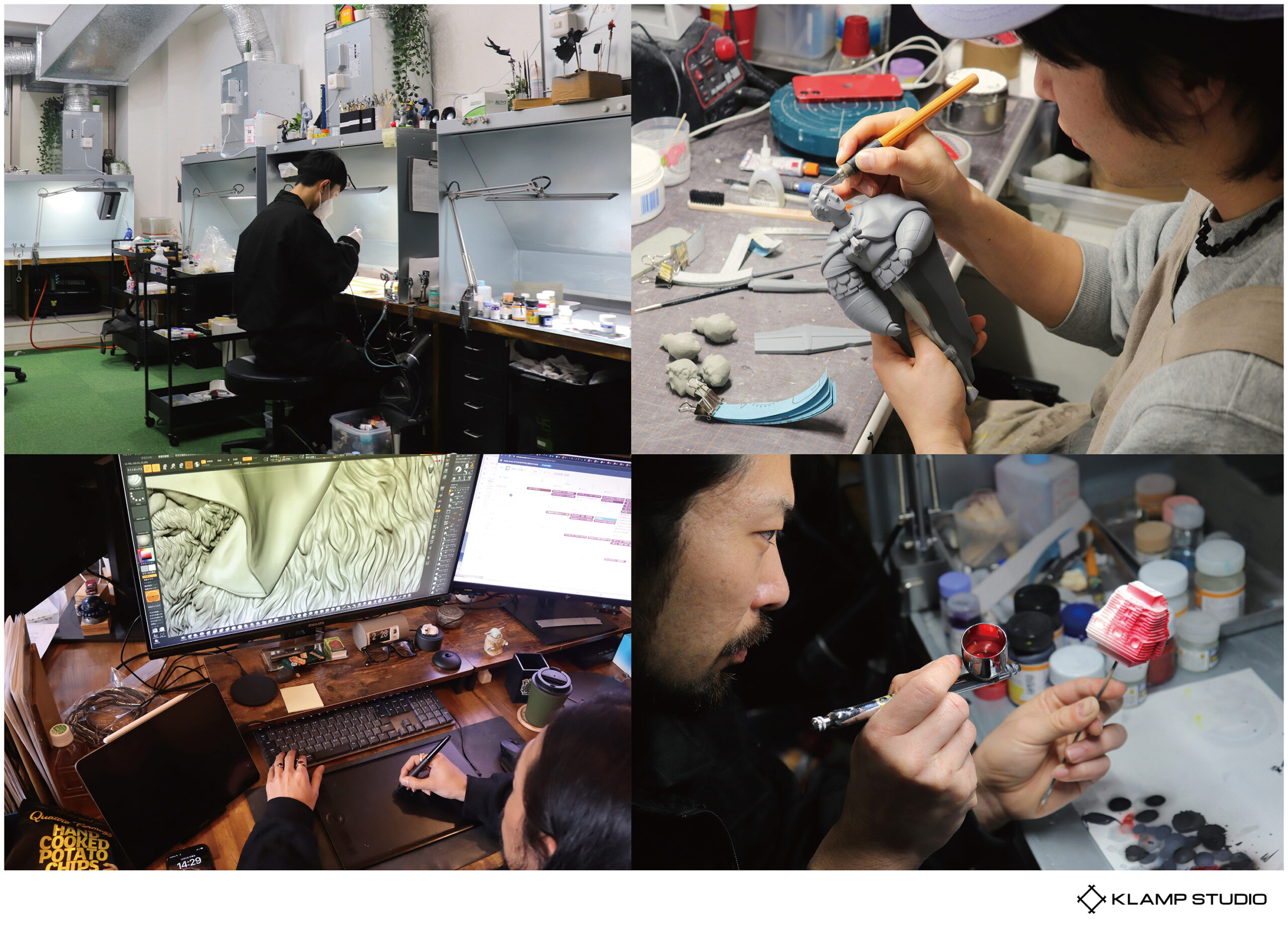 特別協力の「KLAMP STUDIO」はジャンプコミックのキャラクターを中心にフィギュアの原型制作を行っている造形スタジオ。デジタル作業をメインにアナログ作業も横断しながら3Dスキャン/3Dプリント/複製/彩色 といった原型制作の全作業をワンストップで行えるのが最大の特徴で、現在は20名ほどのスタッフが勤務している。