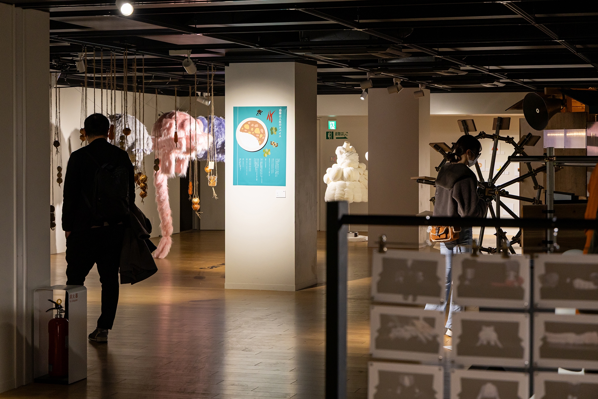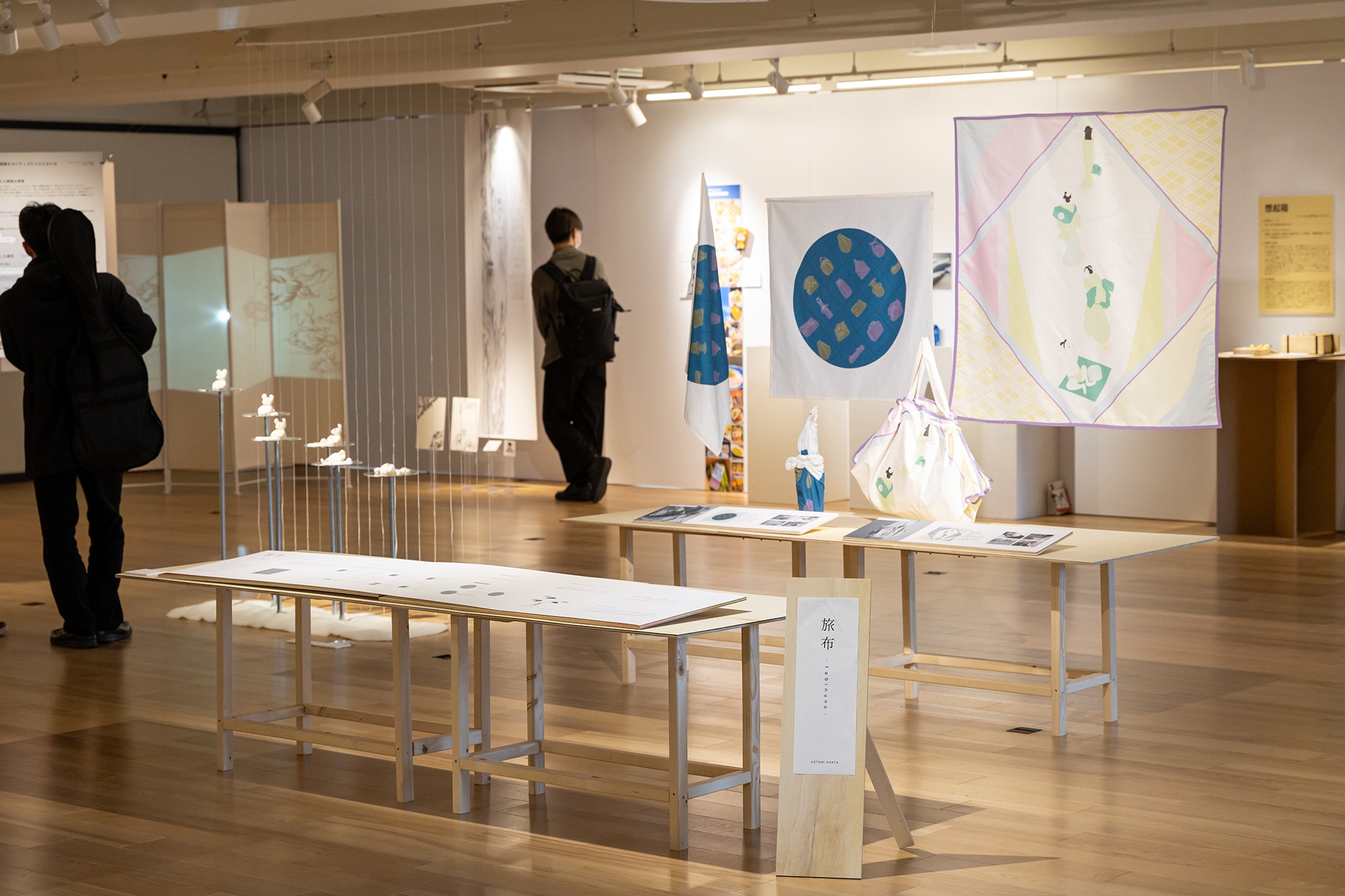 会場では、迫力あるメインビジュアルやフロアマップをはじめとした展示空間の装飾を、卒業・修了展全体のコンセプトに基づき統一感のあるデザインで構成しています。今年度の卒業・修了展の世界観をより深く体験できるよう、空間全体でコンセプトが表現されています。ぜひ学生一人ひとりの作品とあわせて、展示空間そのものもひとつの表現としてお楽しみください。