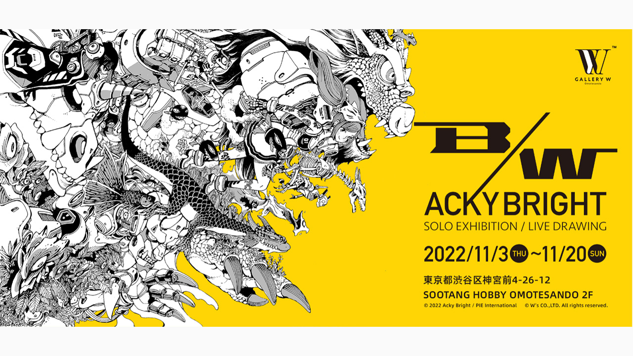 Acky Brightの約1年ぶりの個展となる今回は、新作展示はもちろん、初の商業画集となる「Acky Bright Artbook『B/W』」の先行販売(※1)・原画展示に加え、同氏によるF120号×3連のメガキャンバスへの在廊ライブドローなど必見の内容となっています。会期初日となる11月3日には、会場にて画集へのサイン会も開催予定です。(詳細は近日GALLERY WのSNSにて発表)