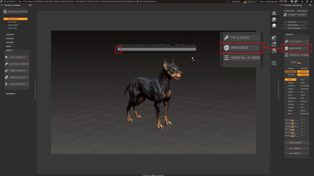 RANDOMIZEはランダムで色々なパーツを組み合わせて動物を生成する機能です。選択すると数字入力が出てきます。「1」はフルランダムで数字が小さくなればなるほど現在のモデルを少し変化させる程度のランダム生成になります。今回は1でやってみます。