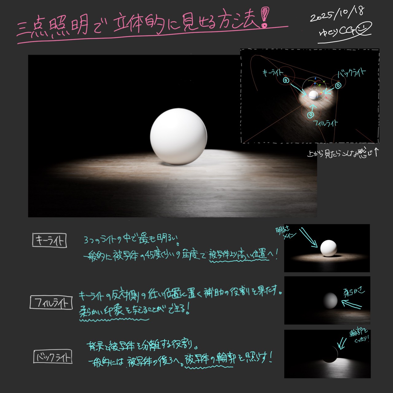 今回は、光と影の基本的な考え方である、3点照明について書きました。