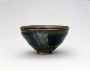 「天目」は抹茶を飲むための茶碗のなかで最も格式の高いもの。漏斗(じょうご)のような独特な器形と黒い釉薬が特徴です。日本の抹茶の源流となる喫茶法(点茶法)が中国で生まれた10世紀、宋時代頃に天目も作り出されて広まりました。日本には鎌倉時代以降、中国から禅の教えをとともに喫茶の風習がもたらされ、天目も輸入されました。茶の湯の世界ではこうした中国産の天目を「唐物天目」と呼んで、とくに重視しています。室町時代には将軍家で用いるに相応しいものを選ぶために格付けが行われ、「曜変(ようへん)」を筆頭に「油滴(ゆてき)」、「建盞(けんさん)」、「鼈盞(べっさん)」、「灰被(はいかつぎ)」などの分類整理が行われました。