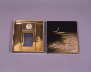 蓋表に荒磯と雲間の三日月を表した硯箱。岩に砕ける波濤を薄肉の金銀高蒔絵で、波に濡れ月に照らし出された岩の輪郭を螺鈿によって表し、平目粉を濃密に蒔いた波飛沫とともに幻想的な光景を描き出している。清水九兵衛(初代、?-1688)は、江戸で修業し、加賀藩3代藩主前田利常に招かれて金沢で加賀蒔絵の基を築いた名工。