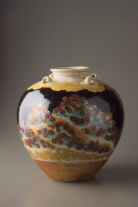 夜景を表したかのような黒を背景に、吉野山に咲きほこる桜の花や金の霞を描いた茶壺。華麗な蒔絵漆器を思わせる黒い釉薬は、上絵付によるもの。野々村仁清(生没年不詳)は、京焼の色絵陶器を大成した江戸時代初期の陶工。優れた轆轤の技と洗練されたデザイン性によって、京都の公家のみならず江戸の武家社会においても人気を博した。