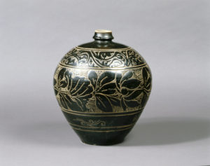 丸く膨らんだ胴部に帯状の蓮唐草を描いた瓶。器全体に施した黒釉を引っ掻き落して素地の灰色を出すことで色のコントラストを生み出す「黒釉掻落(かきおとし)/線彫」の技法を用いている。余白を埋めるハッチング風の手法から、山西省周辺で作られたものと考えられている。