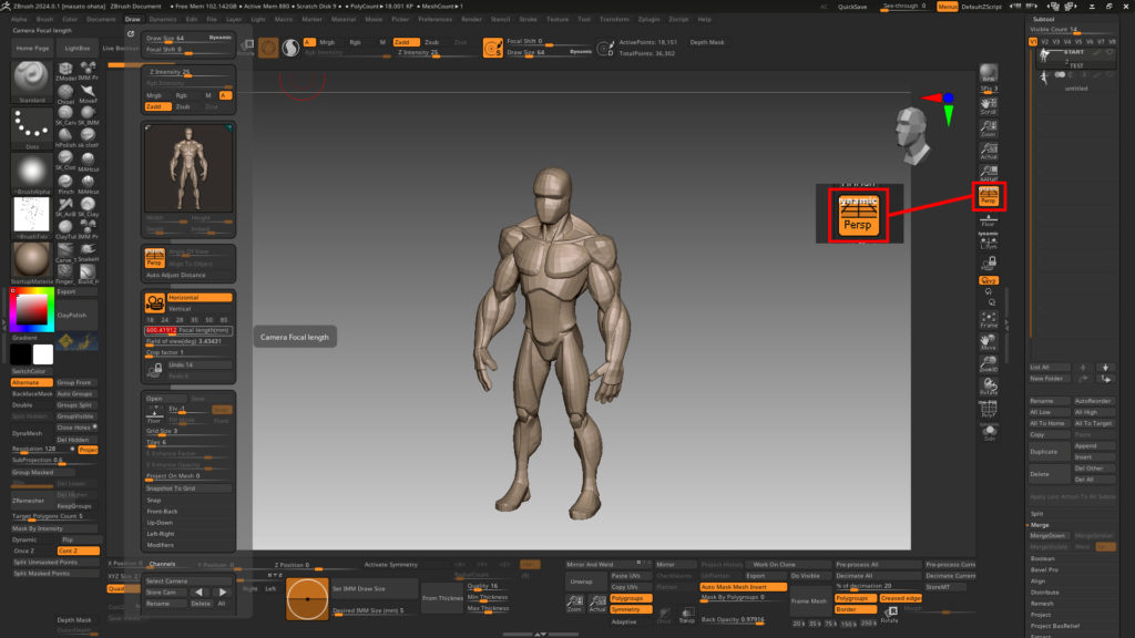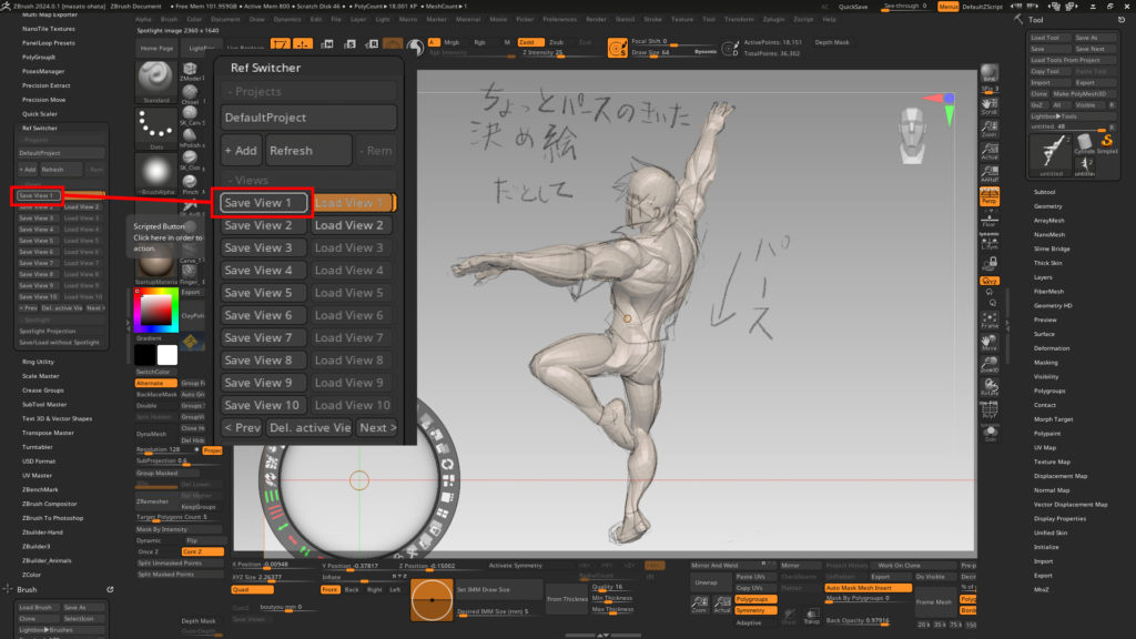 服を作るたびに、髪を作るたびに、パースをOFFにしていても、パースの数値を忘れても、一旦ZTLに保存して作業を中断しても、ZBrushがクラッシュしても!スイッチ1つで決め位置に戻ってイラストと比べることができるのすごすぎませんか!!!ちなみに10個まで画像と角度をセーブできます!1つで十分!