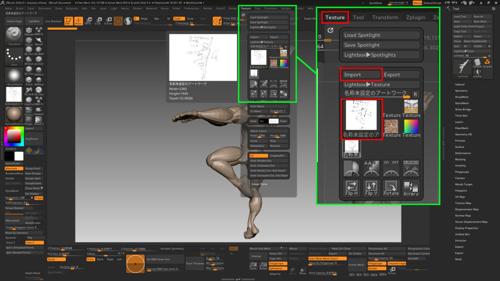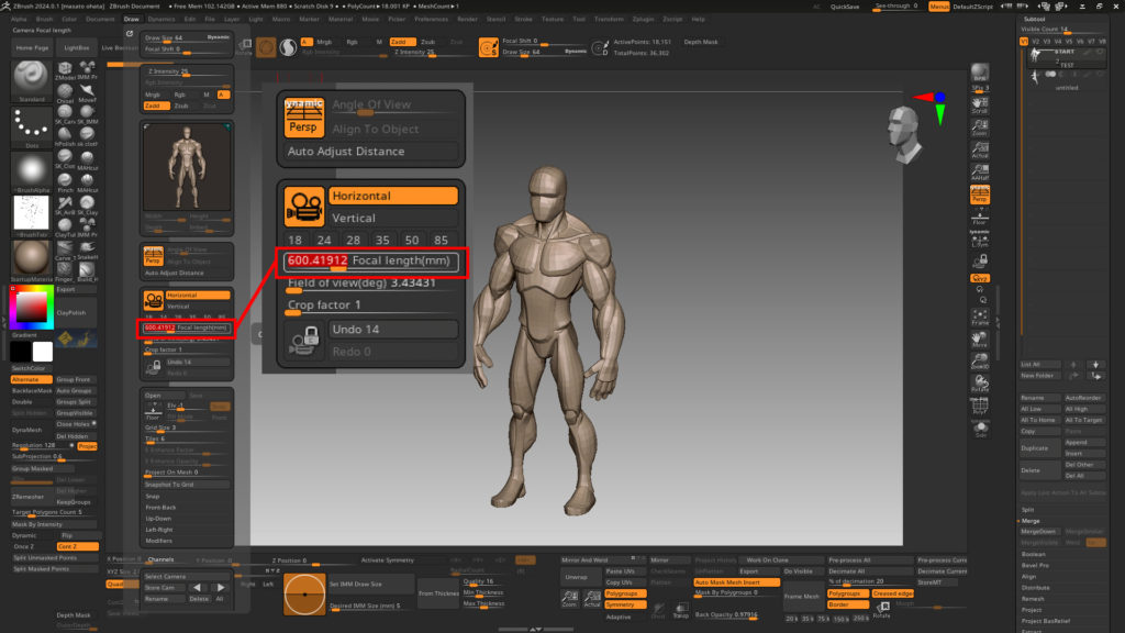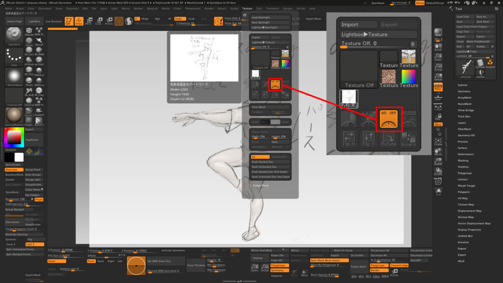 ワールドに正面の位置をつけたまま配置しても、パースの数値をメモったり、ライトボックスの画像を作業開始するたびに(ZBrushがクラッシュして落ちるたびに)やり直さなければなりませんでした。このルーティンの面倒くささがわかるでしょうか……。
