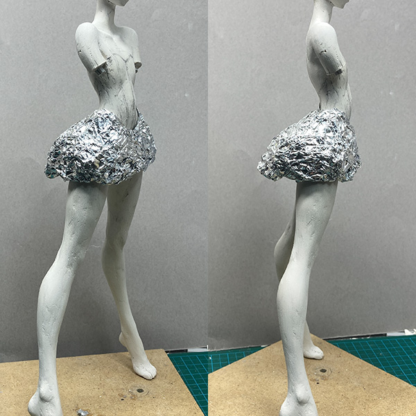 1.スカートのボリュームを出すのに、アルミホイルで台を作っておきます。粘土を伸ばしたものは結構重いので支えられるようにくしゃくしゃにして中身も詰めておきます。