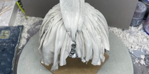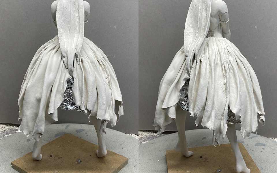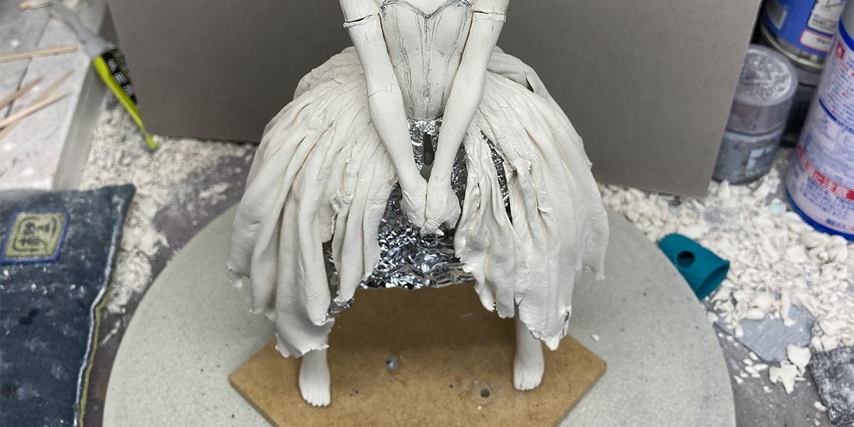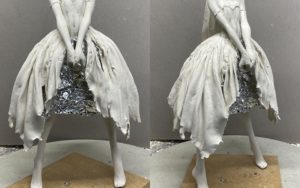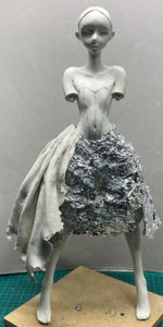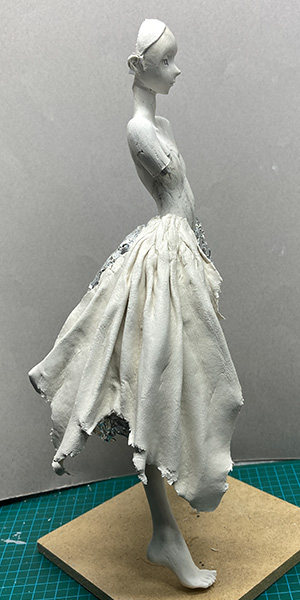 4.この段階では完全にシワを作ってしまわず、いったん固めてから良い感じに盛ったり削ったりしていきます。スカートの破れた部分は、実際にニューファンドをちぎって表現します。