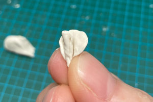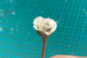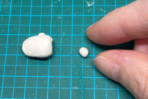 1.1枚ずつ花びらを作っていきます。まずは1枚分の粘土を取り、丸めます。花のサイズによって違いますが、今回の小さめのバラの場合は3mm球くらいかなと思います。