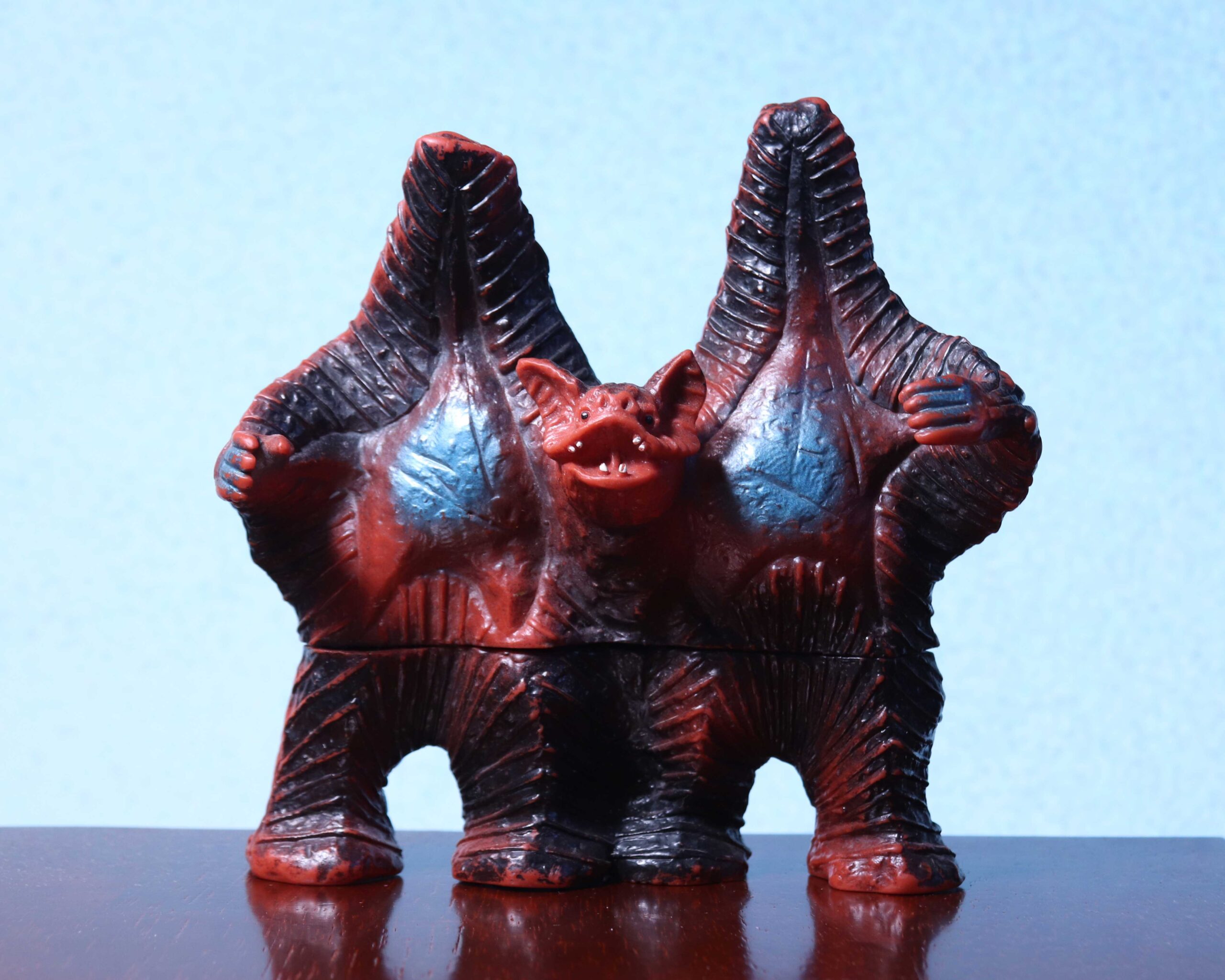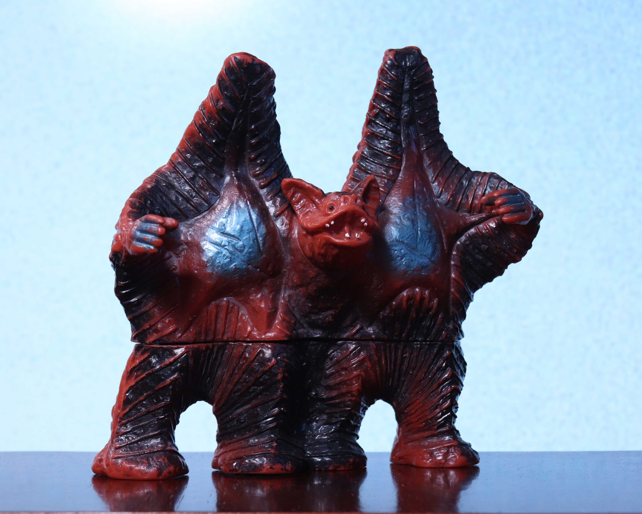 それまでのマルサン・ブルマァク系の柔らかく優しい造形、そして後年のバンダイソフビのしっとりとした質感と比べると、彫りは深く、どこか荒々しい。ごつごつとしたザラつきのある体表は、ソフビという素材と相性がよく、カラフルなスプレー、とりわけメタリック塗装では、光が乱反射しているかのような錯覚を覚える。