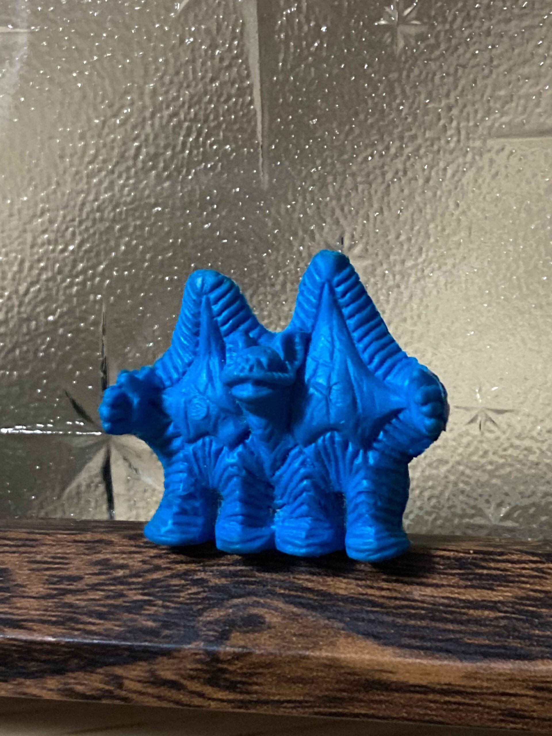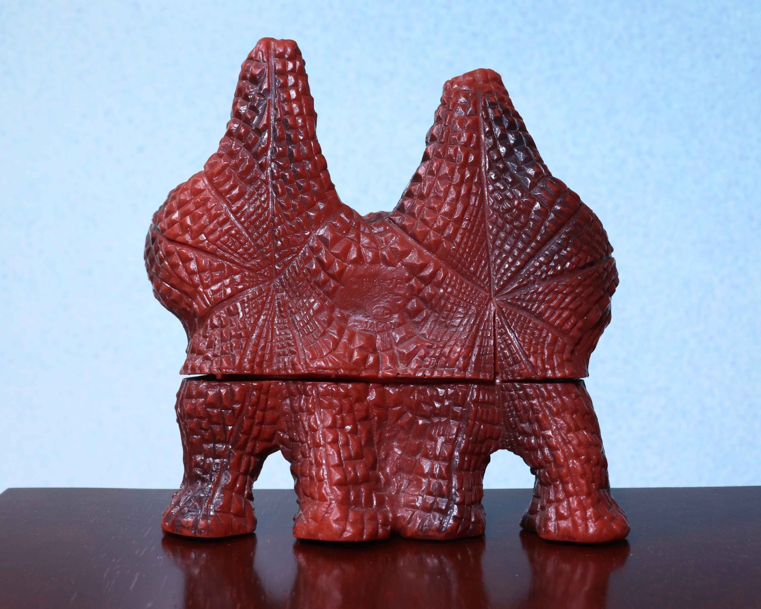 劇中、海から出現するぶよっとした質感、製油所に上陸して明らかになる巨大な全身。ご存じのようにペスターは二名の役者が横並びで演技する、ヒトデが連なったようなデザインの怪獣である。ちょうど役者の頭部に位置する箇所が一対の「山」のようになっており、それが「顔のない顔」に見えることがあるのだ。まるでのっぺらぼうのような表情のない不気味さ、それもペスターの魅力である。ペスターとの出会いは本編が先か、このソフビ人形の写真が先か、今となってはわからない。