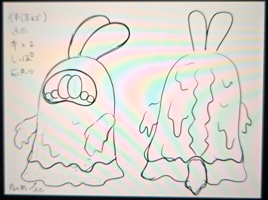 2022年頃から制作開始。最初は六つ目の案もなく、キノコのキャラクターでした。2作目から六つ目の案が出てきてますが、キャラクターの方向性が定まってない状態です。