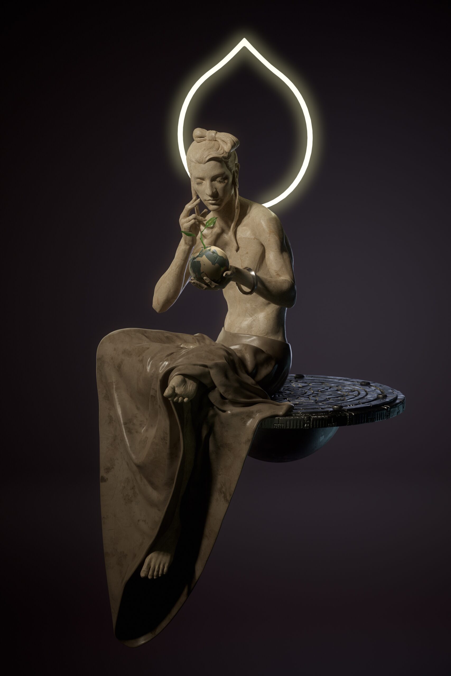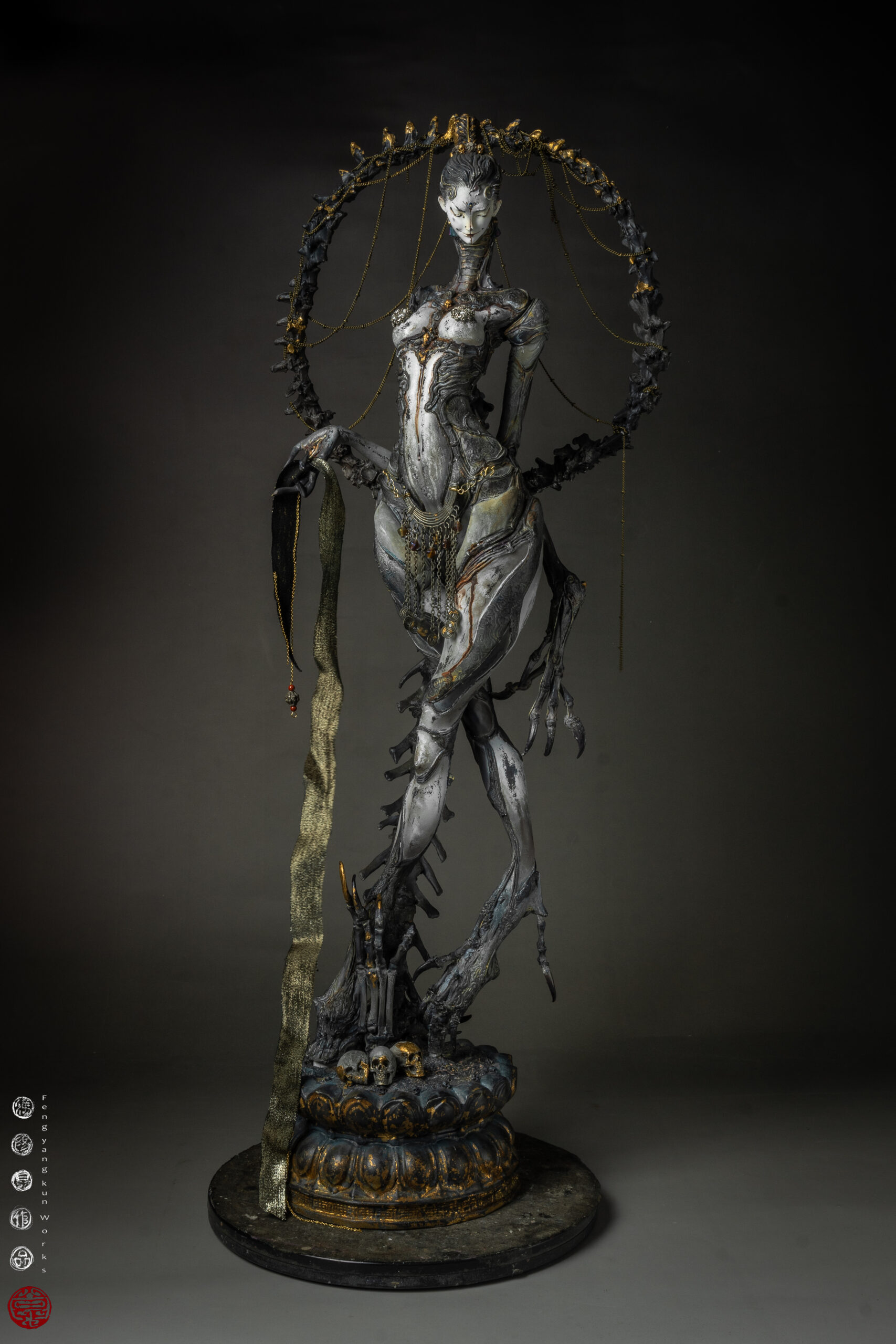 【作品解説】56億年の時を越え、文明が終焉した後もなお、誰かを待ち続ける未来仏・弥勒菩薩。微笑みにはまだ手を差し伸べるべきものが残され ているかもしれない希望が宿り、かつての文明の名残や未来の可能性を静かに見守っています。手首のメビウスの環には、人間の営みや 文明の興亡さえ繰り返す「輪廻の永遠性」を込めました。
