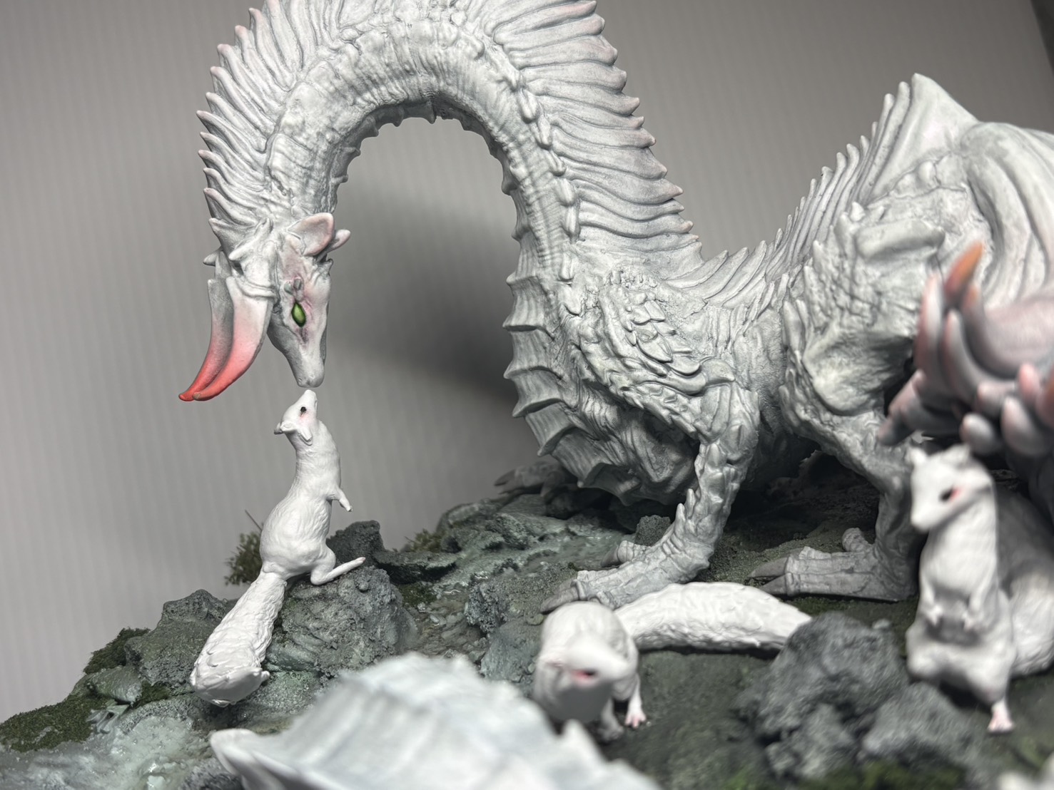 【作品解説】オリジナルのドラゴンと小さな動物たちをモチーフにした作品です。白い姿が共通の特徴で、種は違ってもどこか似通った存在として表現しました。異なる生き物同士が互いに寄り添い、自然に受け入れているような優しい雰囲気を目指しています。