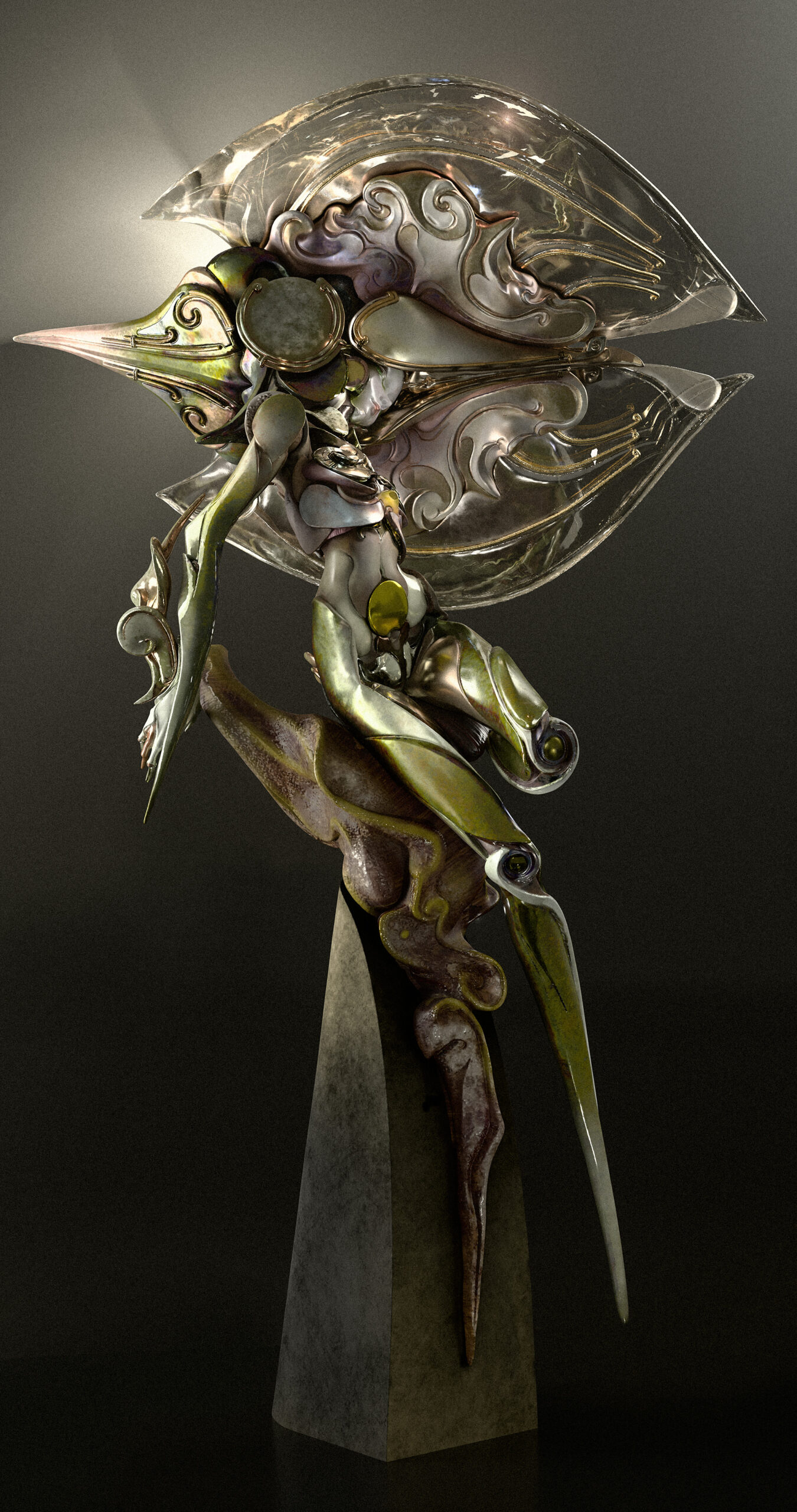 造形を構想する際、柔軟と硬質の対比を意識し、少女のイメージに冠と金属の胸郭を加えた。