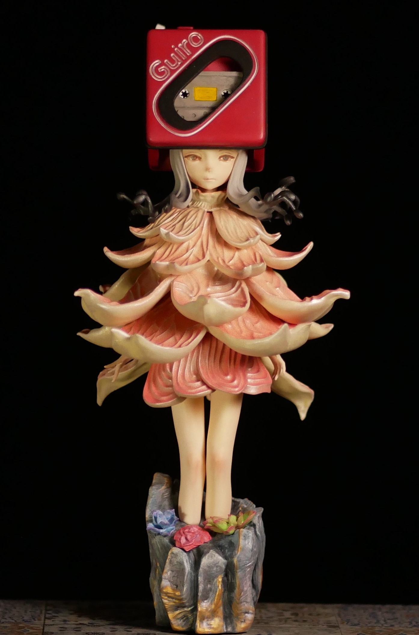 今回の作品のタイトルは、少数の者にしか使われない=離れた場所にある小さな岩の上にミュージックプレーヤーで鳴らす音楽が静かに咲いている、という意味です。というのはほぼ後付けで、単に私が音楽好きで懐かしいラジカセを作りたいという気持ちと、ラジカセを女の子が被っていたら可愛いなという思いから、これまで何体も制作しています。