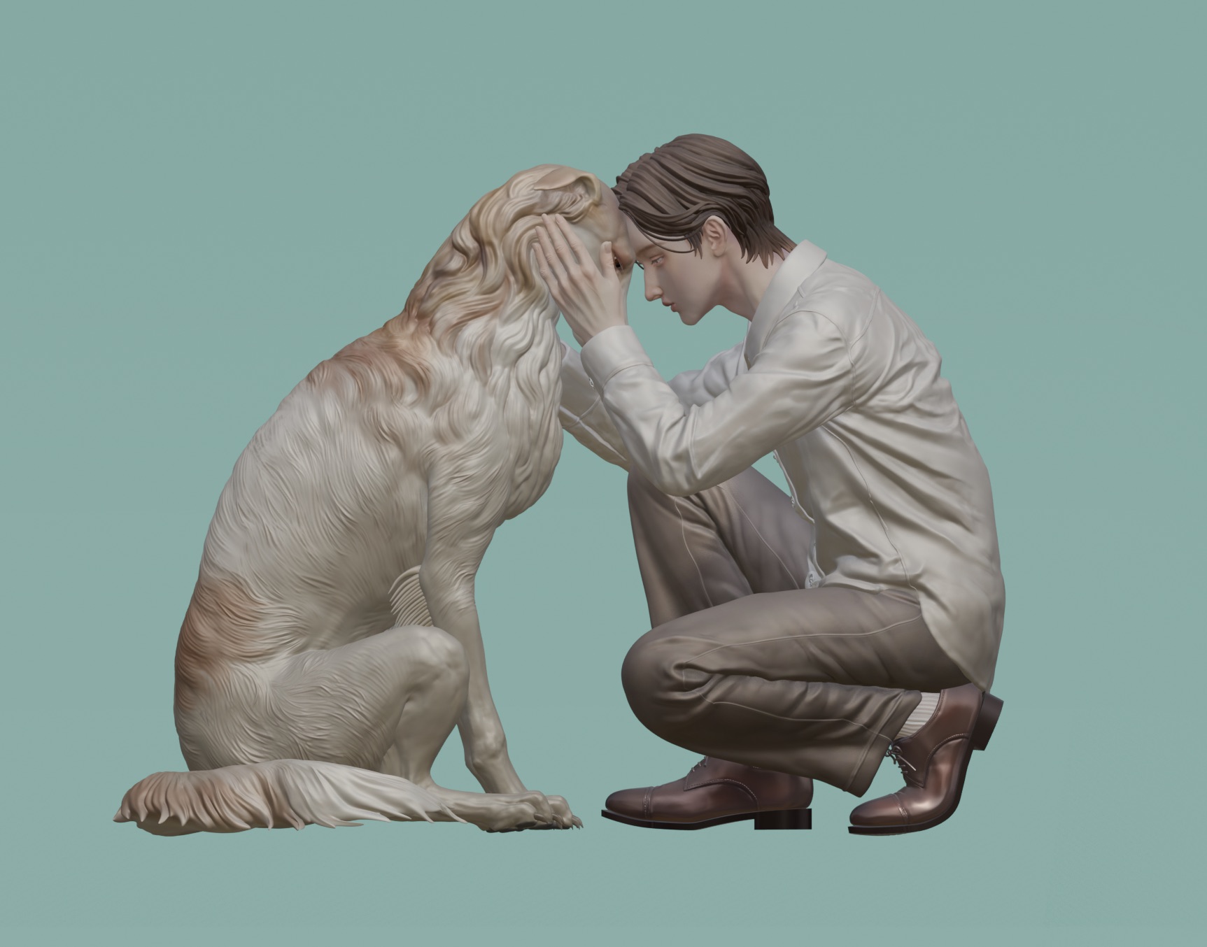 【作品解説】美しい犬と青年を制作しました。ボルゾイという犬種の美しい犬と、その飼い主である青年が、額を合わせて心を通じ合わせている様子です。少し伏せた視線から、相手を慈しむ穏やかな感情を表現しています。