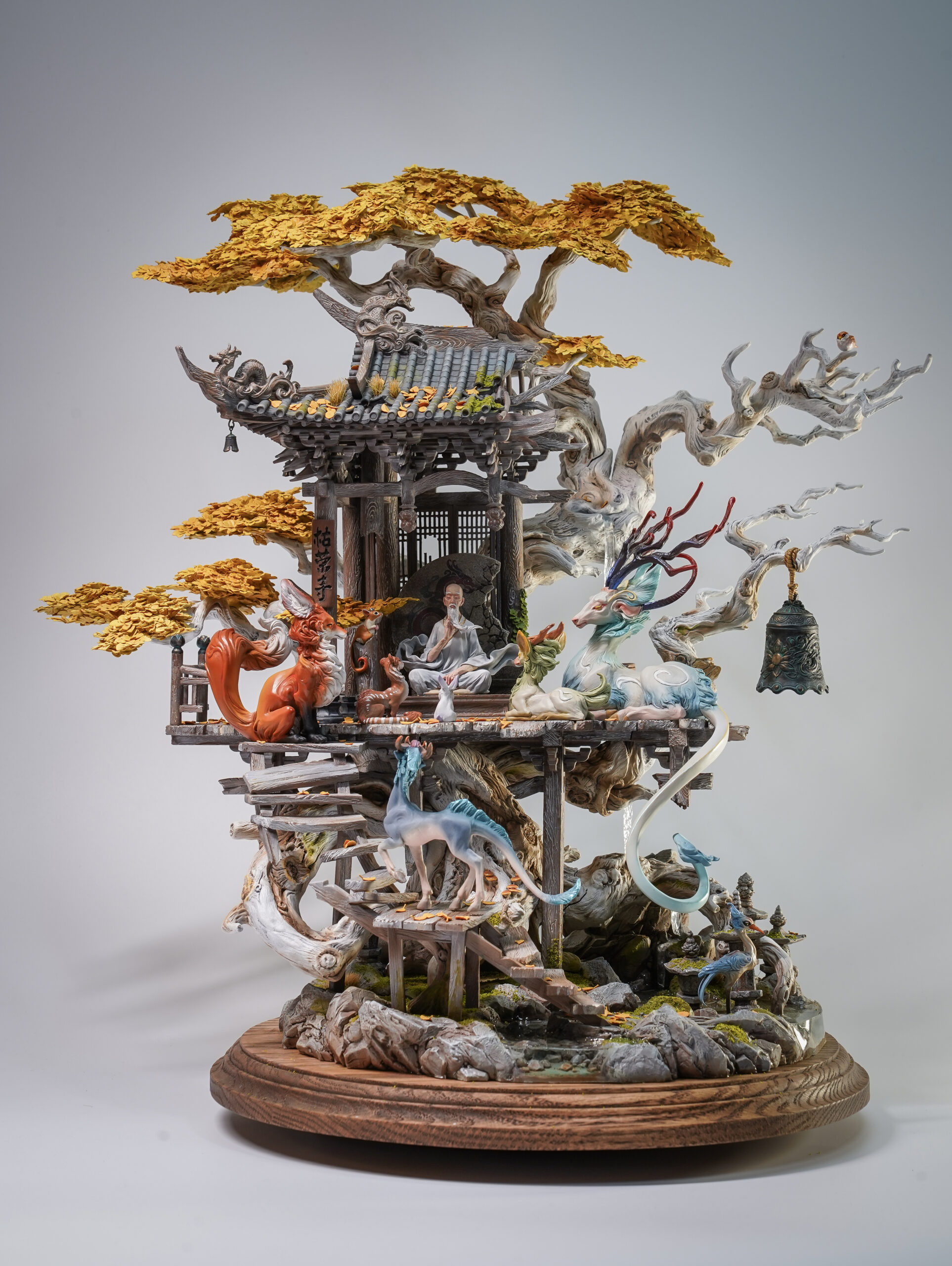 塚田:素晴らしい造形力。圧巻の作品です。普通ならこれだけディテール、キャラクターを作り込んでいると全体にうるさく感じるところを、木のうねりからの葉のない朽ちた部分への動き、生物の角、老師の服のなびきなどで感じる右上に抜ける流れが洗練された印象ですごくカッコいいです。その先端にいる雀(のような生き物)も素敵ですね。