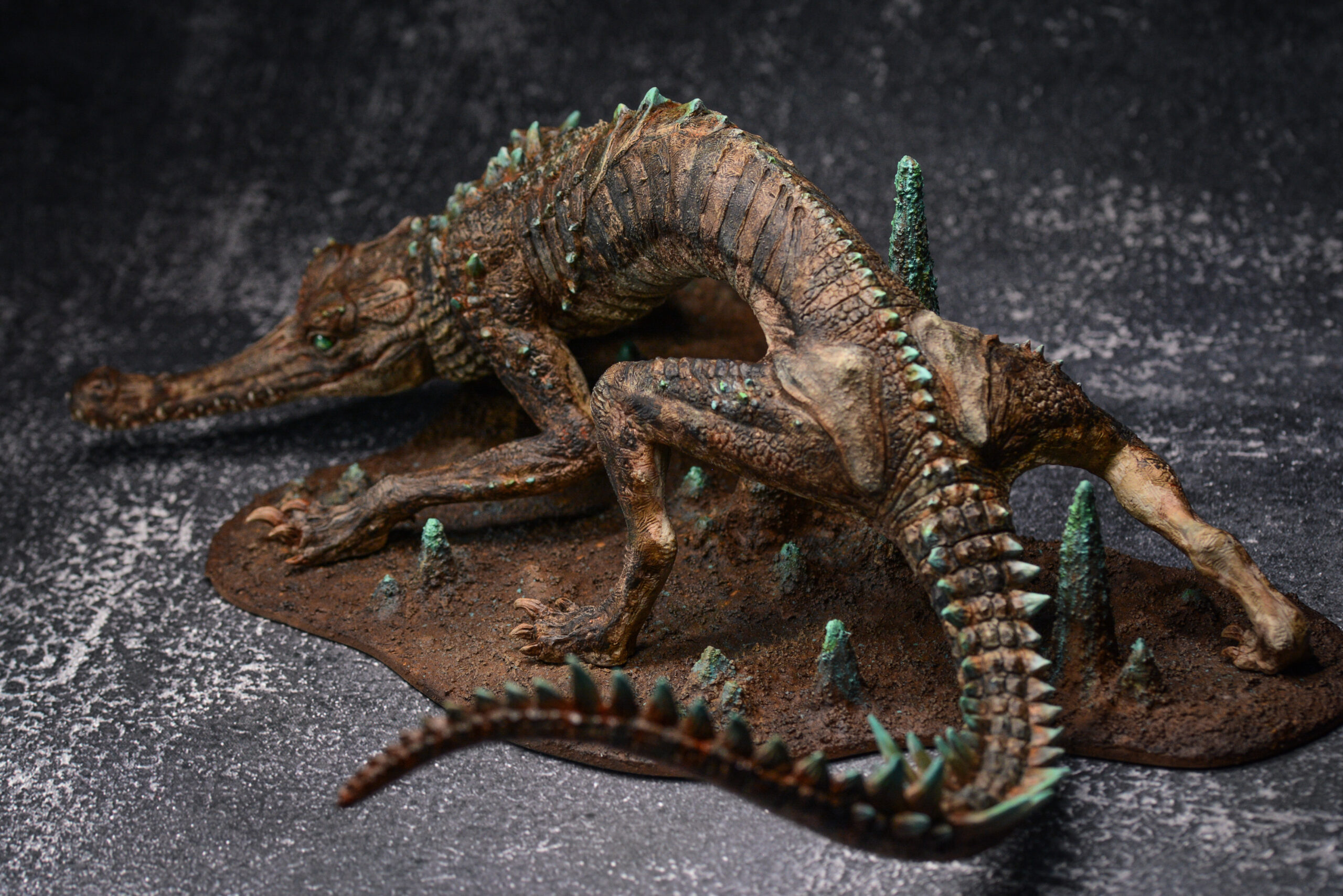 【作品解説】暗い洞窟に生息し、素早く動く捕食者。洞窟内の岩の尖端は鉱物や藻類の影響で青緑色に輝き、「翠棘の潜行獣」の体の棘も同様の青緑色を帯び、独特な環境の中で身を隠す効果を持つ。