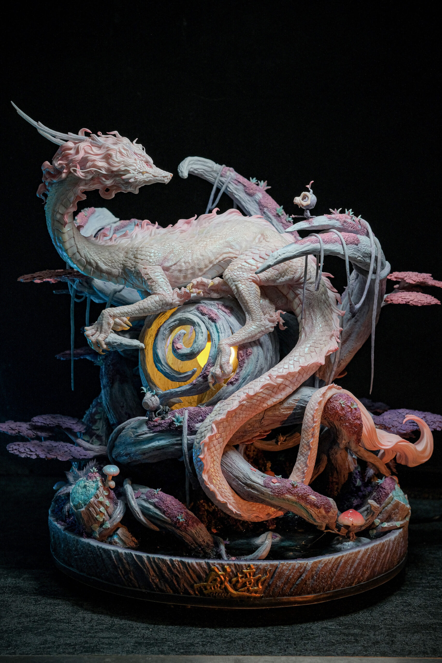 【作品解説】オリジナルの幻想世界の龍類生物がテーマの彫刻作品です。主人公の青玄龍は中国の五爪金龍をデザインベースに、西洋の竜と現代解剖学を融合させて創作した幻想生物です。伝統的な中国の龍は鷹の爪と蛇の体を持つが、そこにはリアルさと力強さが足りないと感じたため、獣類の体と霊長類の肢体の構造を融合させました。特に後ろ脚のデザインは関節を一節追加したため、伝統的な獣類の後肢でも霊長類のそれでもなく、現実に存在しないが調和が取れています。幻想生物のデザインは、常識を打ち破ることこそ面白いと考えています。