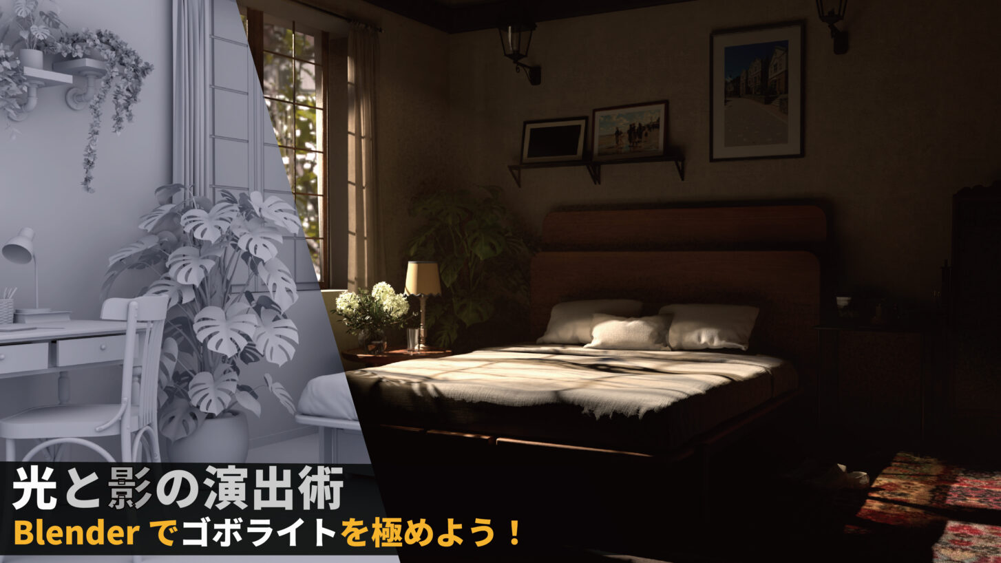 ここからはBlenderでゴボライトを活用する方法について解説します。今回はこちらのシーンのような、窓から木漏れ日が差し込む光を作ります。