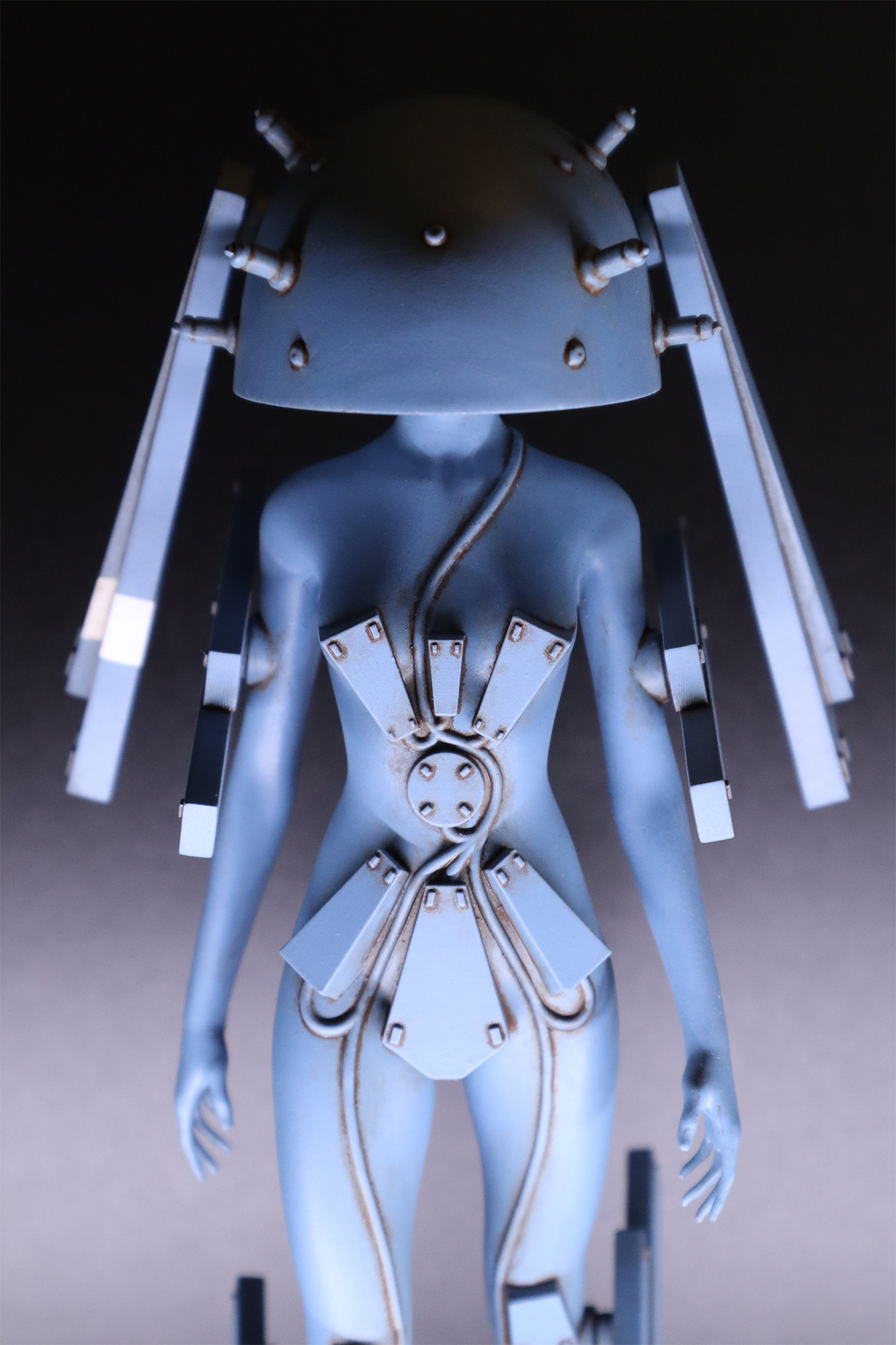 【作品解説】機械と融合しながら⽣きていく⼈間をモチーフにした作品です。体に取り付けられた各部分のパーツは⽣命維持を補うもの、⾝体能⼒を向上させるもの、頭に付けられたインターフェイスによる視覚情報の不⾜を補う通信装置などで構成されています。また、この通信装置により、他の⼈間との意思疎通を取っているという設定です。
