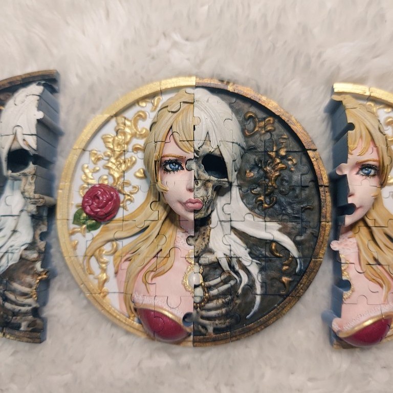【作品解説】今回制作したのは、半⽴体の造形を⽤いたパズル作品です。モチーフは「美しい⼥性」、そしてその美しさがやがて朽ち果てていく様⼦。同⼀の分割⽅法を⽤いた2種類のパズルを⽤意し、ひとつは若く華やかな姿、もうひとつは朽ち果てた姿を表現しています。