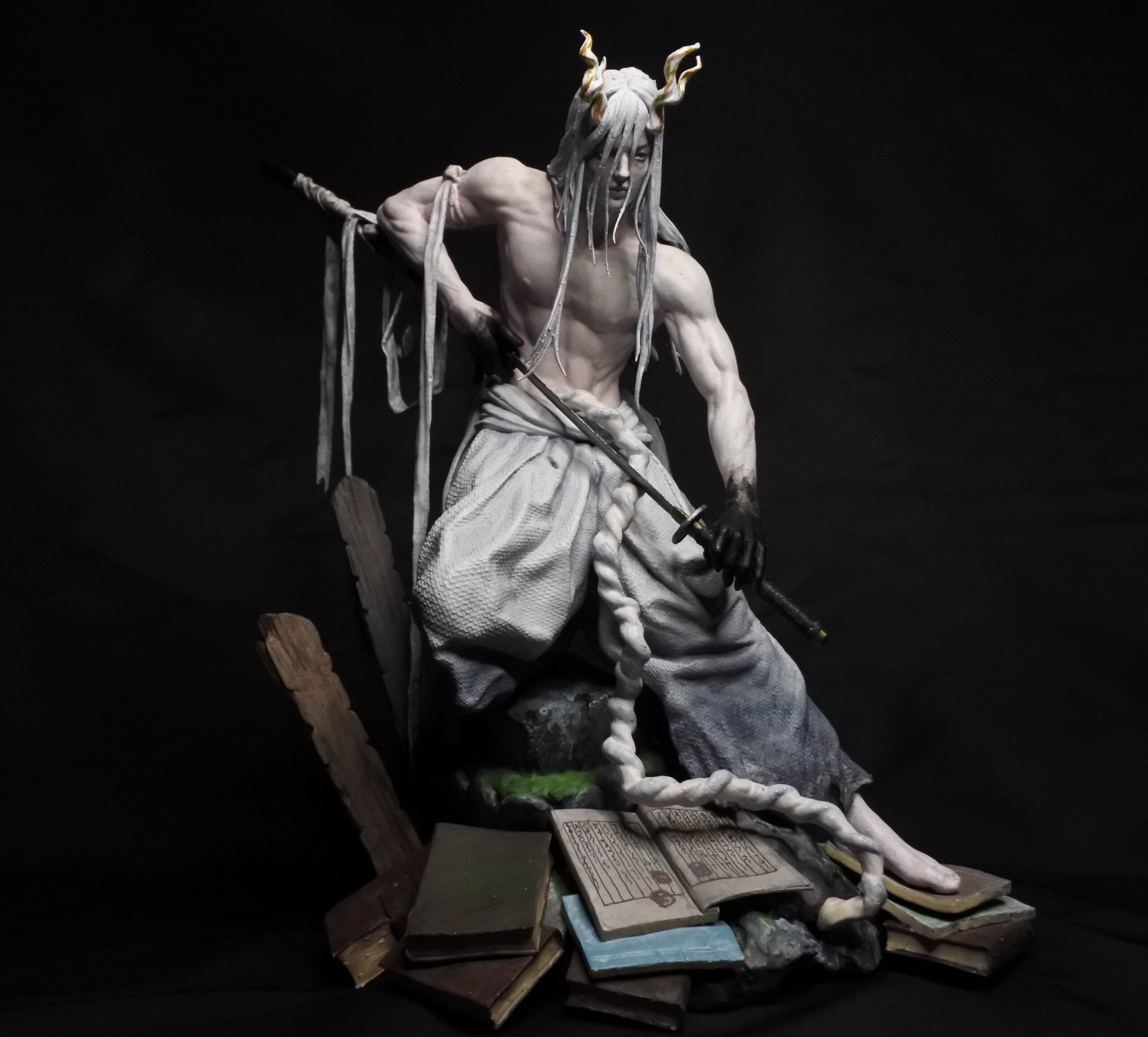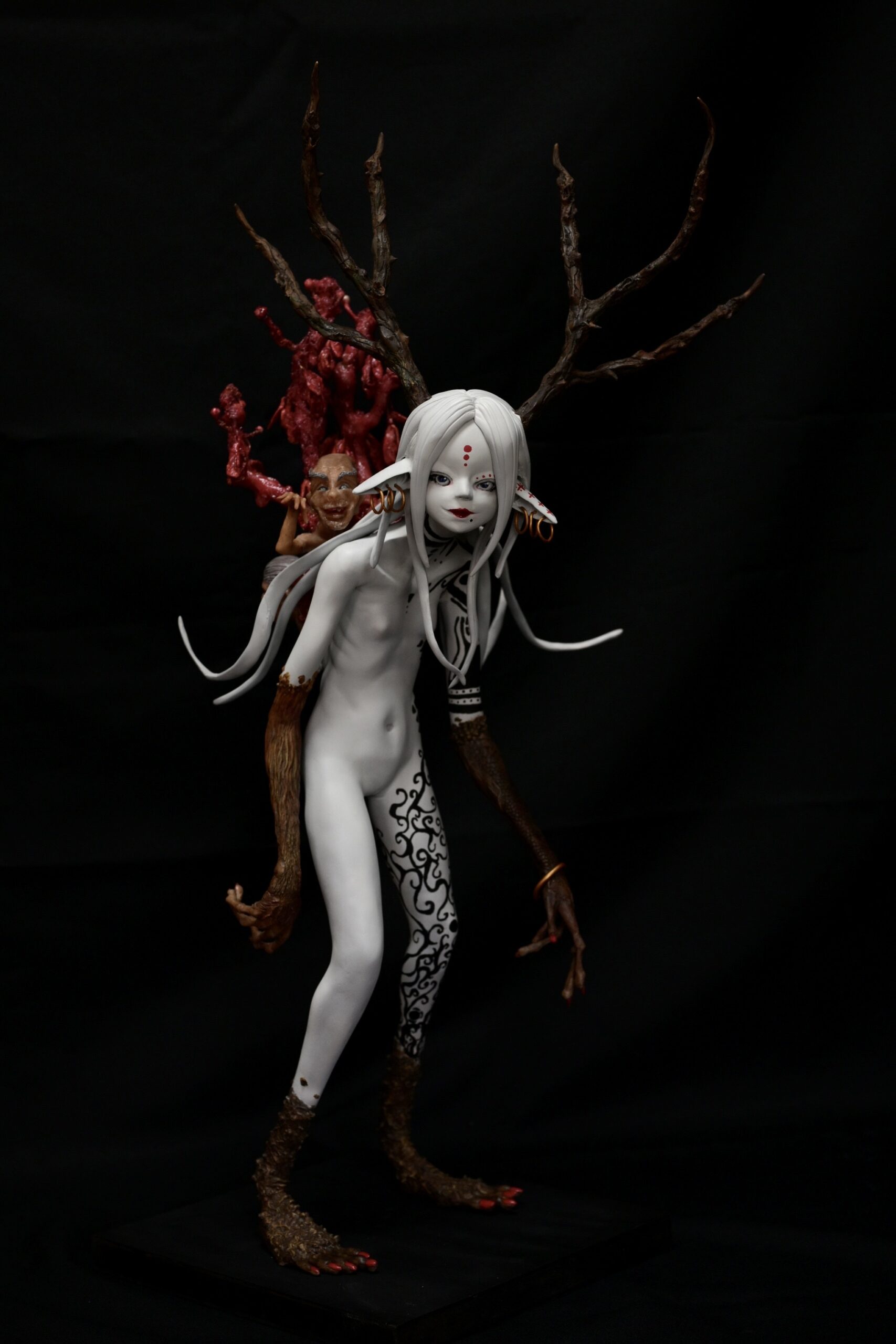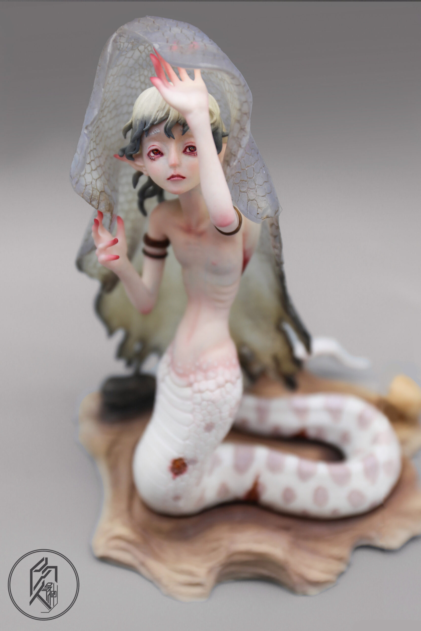 塚田貴士(以下、塚田):種族や顔つき・体型、全体に纏う雰囲気がこの子がたどってきた運命を想起させます。特に塗装で表現しようとしている部分が目を引きますね。全体の色調があまり光の当たらない暗い場所で過ごしたのかなとか、髪や面相・体の赤みの帯び方に可愛げを感じたり、胸の辺りににうっすらと血管を浮かせることで感じる肌の透明感、人肌と蛇的な部分の境目、傷の表現などにこだわりを感じます。