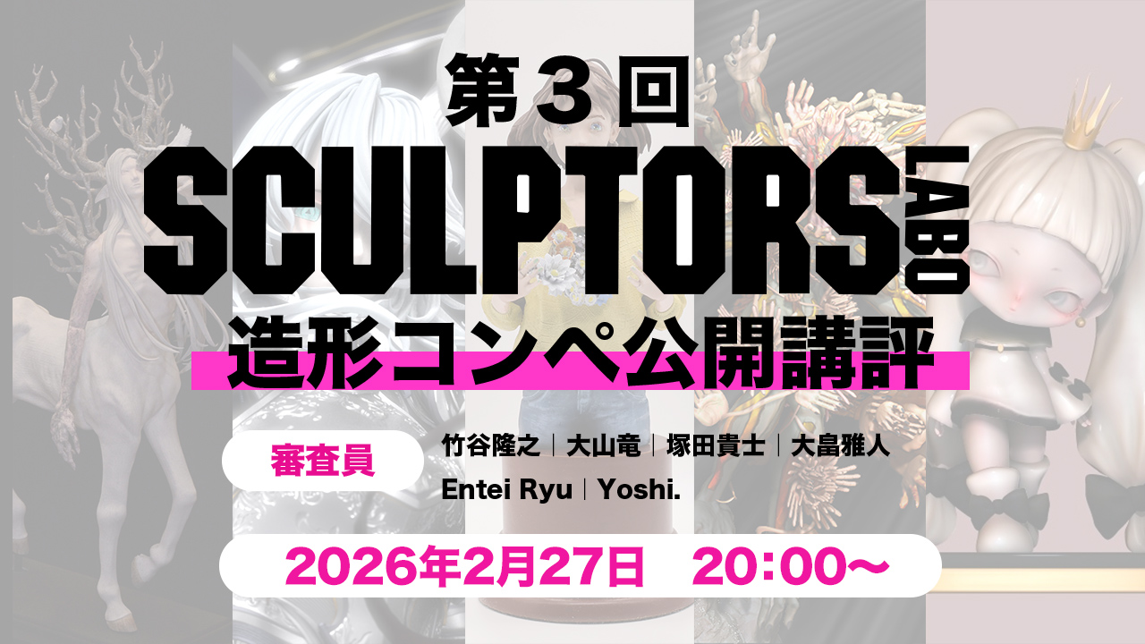 2月27日(金)20時より、第3回スカルプターズ・ラボ造形コンペ応募作品の中から事前に募集した10作品+大賞作品を対象に、審査員の竹谷隆之さん、大山竜さん、塚田貴士さん、大畠雅人さん、Entei Ryuさん、Yoshi.さんが公開講評を行います!講評の様子はYouTubeにて無料配信いたしますので、ぜひご覧ください!