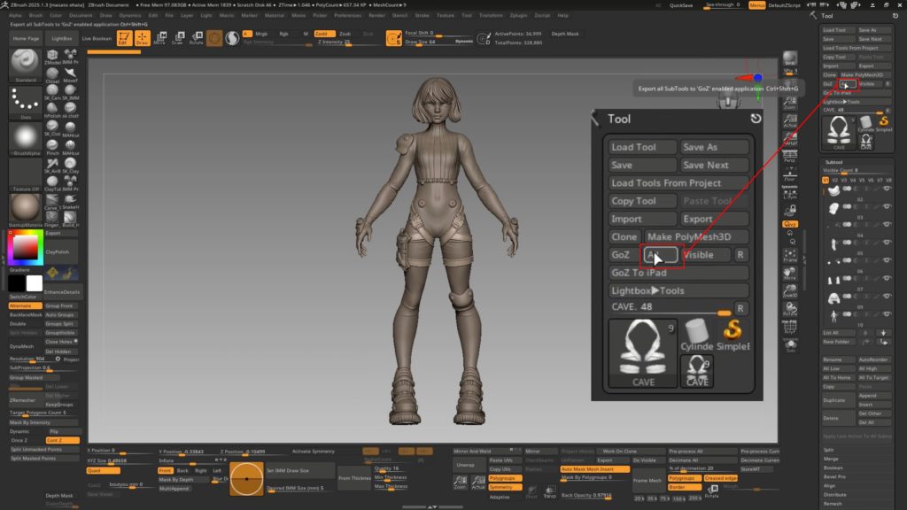 17.ポーズが決まりました。これをZBrushに移動する場合は、