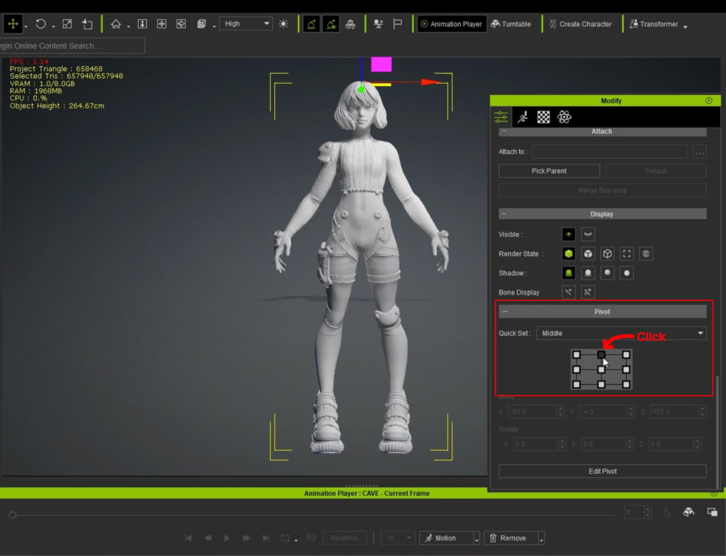 6.ModifyからPivotで頭の位置を選択すると、