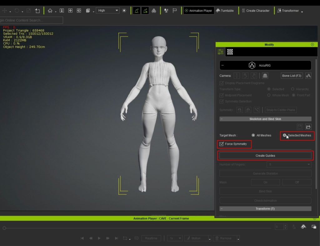 10.AccuRIGからSelected Meshesを選択してForce Symmetyにチェックが入っていることを確認し、Creat