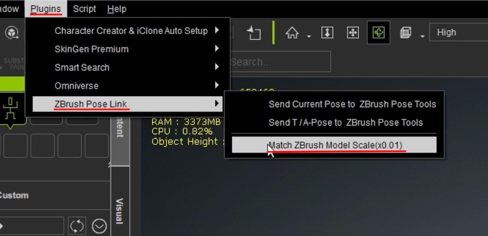 Plugins>ZBrush Pose Link>Send Current Pose to ZBrush Toolsで簡単に変更後のポーズのままZBrushに移動する
