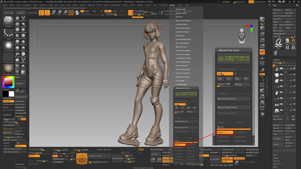 20.このポーズはZplugin>ZBrush Pose ToolsのPose 1で管理されているので、このチェックを外せばTポーズに戻るこ