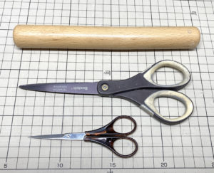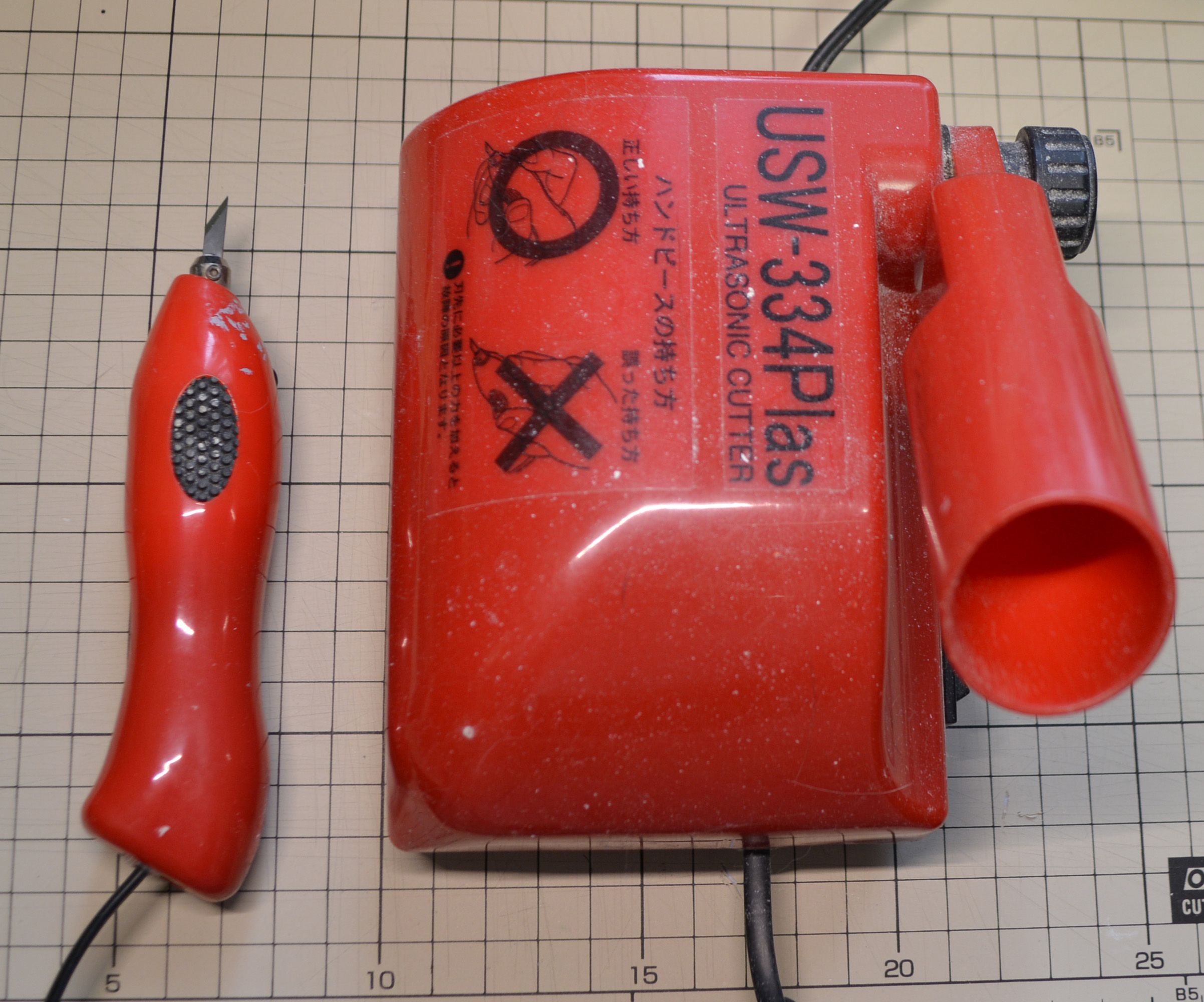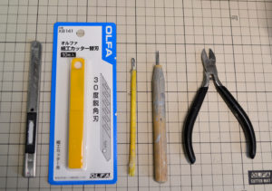 左からカッター、替え刃(30度鋭角刃)、自作スパチュラ、千枚通しのようなもの、ニッパー