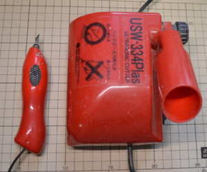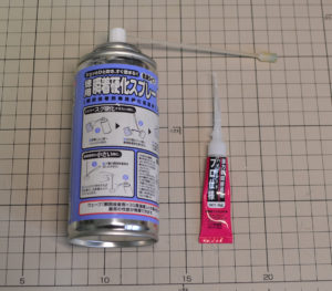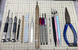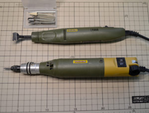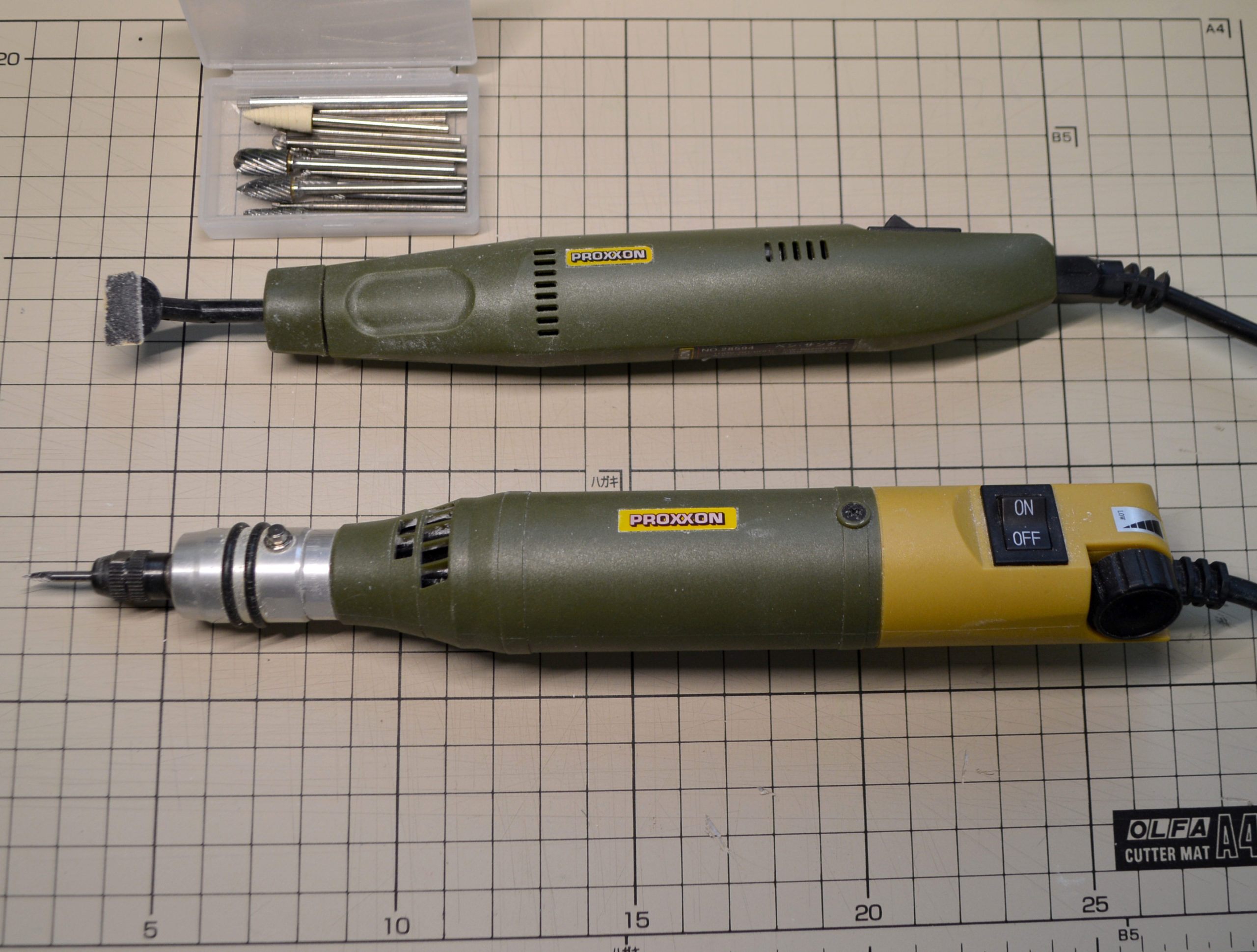 左からピンバイス(2.0mm、1.5mm、1.0mm、0.5mm)、やすり掛けスティック、両面テープの貼り付けた紙やすり(タミヤフィニッシングペーパー180番、400番)、ピンセット、彫刻刀(丸刀、平刀3.5mm、2.4mm、1.0mm)、ダイヤモンドヤスリ(自作改造品、ダイヤフィニッシュ#200、#400、#600)、ラジオペンチ