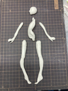 3.各パーツをつなげてポーズを決めていきます。つなぐ際は瞬間接着剤で軽く止めて、ファンドを盛ります。強度が必要な時はつまようじを入れてつないだりします。後からポーズ変更などで切る時に邪魔になるので、中に針金は入れません。