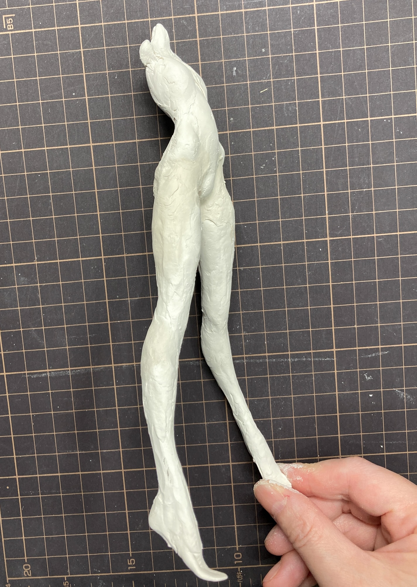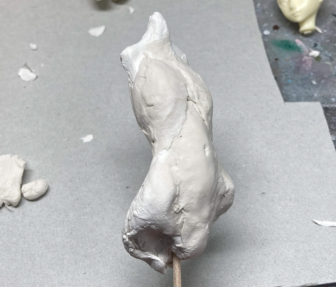 1.ニューファンドで芯を作り、ざっくり形出しをします。上半身は細めで腰が広いバランスが好きなので、胸部は狭く骨盤辺りは大きめにしておきます。横から見た時にS字を描いていると綺麗なのでお尻とお腹でラインを作ります。